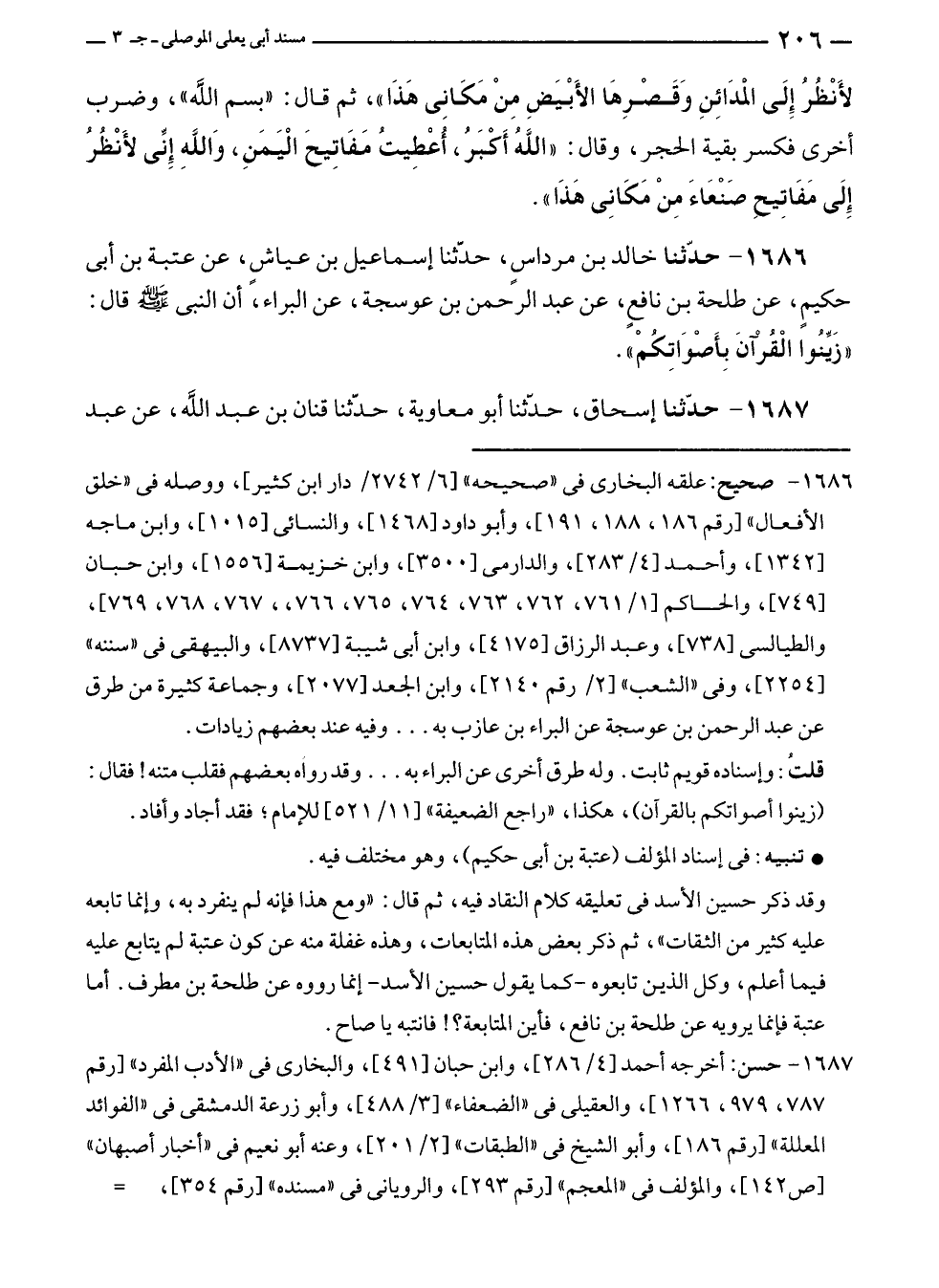 ١٦٨٦ - حدّثنا خالد بن مرداسٍ، حدّثنا إسماعيل بن عياش، عن عتبة بن أبى حكيمٍ، عن طلحة بن نافعٍ، عن عبد الرحمن بن عوسجة، عن البراء، أن النبي - صلى الله عليه وسلم - قال: "زَيِّنُوا الْقُرْآنَ بِأَصْوَاتِكُمْ".