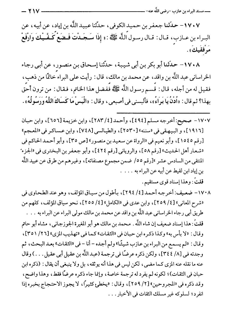 ١٧٠٨ - حدّثنا أبو بكر بن أبى شيبة، حدّثنا إسحاق بن منصورٍ، عن أبى رجاء الخراسانى عبد الله بن واقد، عن محمد بن مالكٍ، قال: رأيت على البراء خاتمًا من ذهبٍ، فقيل له من أجله، قال: قسم رسول الله - صلى الله عليه وسلم - ففضل هذا الخاتم، فقال: من ترون أحق بهذا؟ ثم قال: "اُدْنُ يَا بَرَاءُ"، فألبسنى في أصبعى، وقال: "الْبَسْ مَا كسَاكَ الله وَرَسُولُهُ".