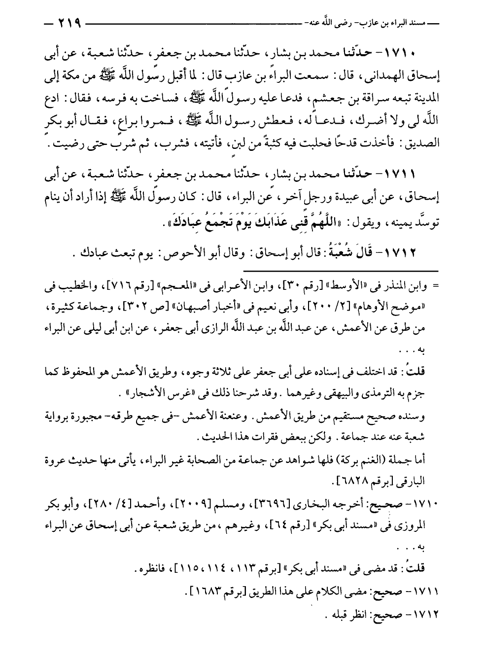 ١٧١٠ - صحيح: أخرجه البخارى [٣٦٩٦]، ومسلم [٢٠٠٩]، وأحمد [٤/ ٢٨٠]، وأبو بكر المروزى في "مسند أبى بكر" [رقم ٦٤]، وغيرهم، من طريق شعبة عن أبى إسحاق عن البراء به ...