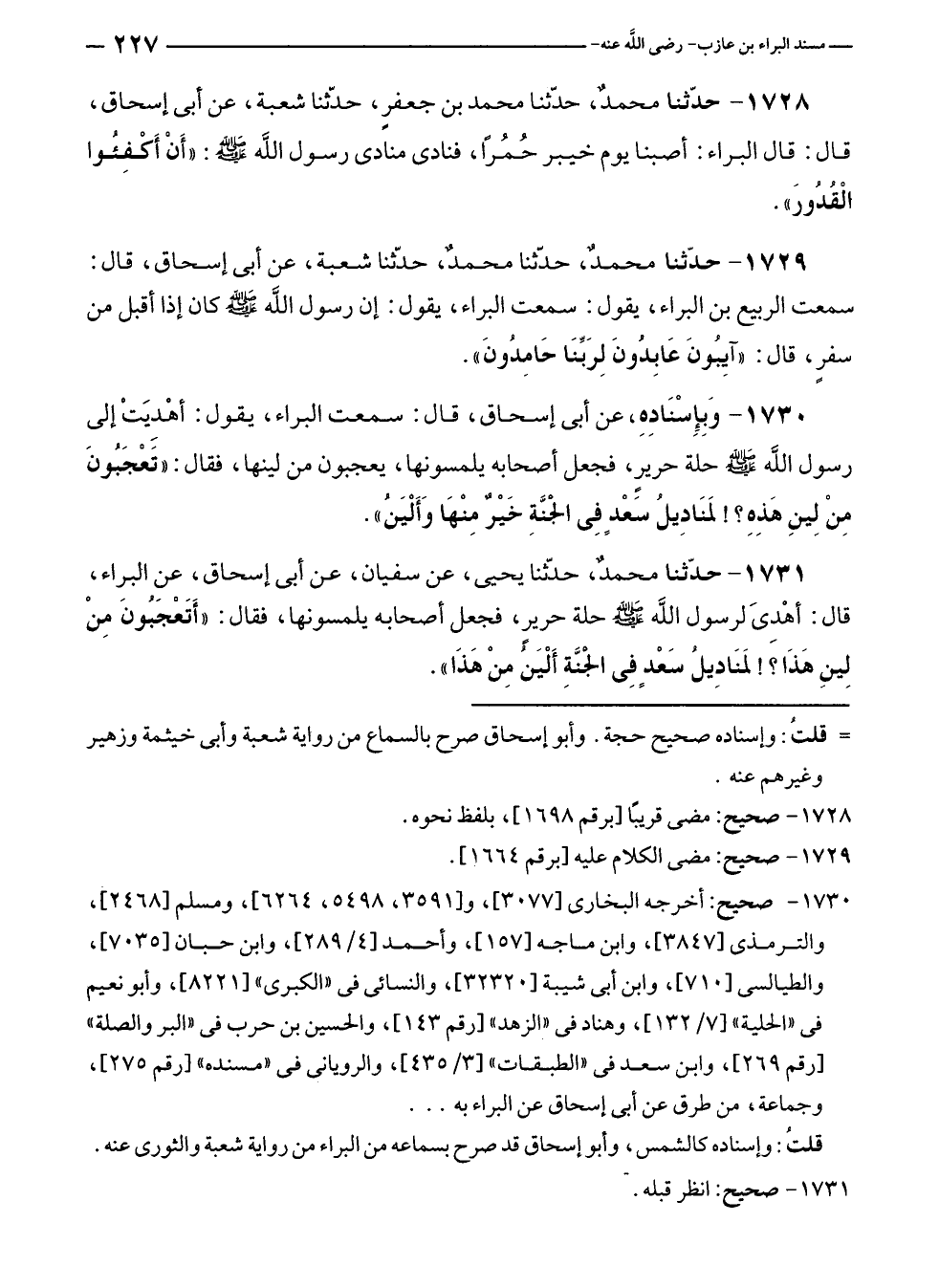 ١٧٣٠ - وَبِإِسنَادِهِ، عن أبى إسحاق، قال: سمعت البراء، يقول: أهْديَتْ إلى رسول الله - صلى الله عليه وسلم - حلة حرير، فجعل أصحابه يلمسونها، يعجبون من لينها، فقال: "تَعْجَبُونَ مِنْ لِينِ هَذِهِ؟! لمَنَادِيلُ سَعْدٍ فِي الجَنَّةِ خَيْرٌ مِنْهَا وَأَلْيَنُ".