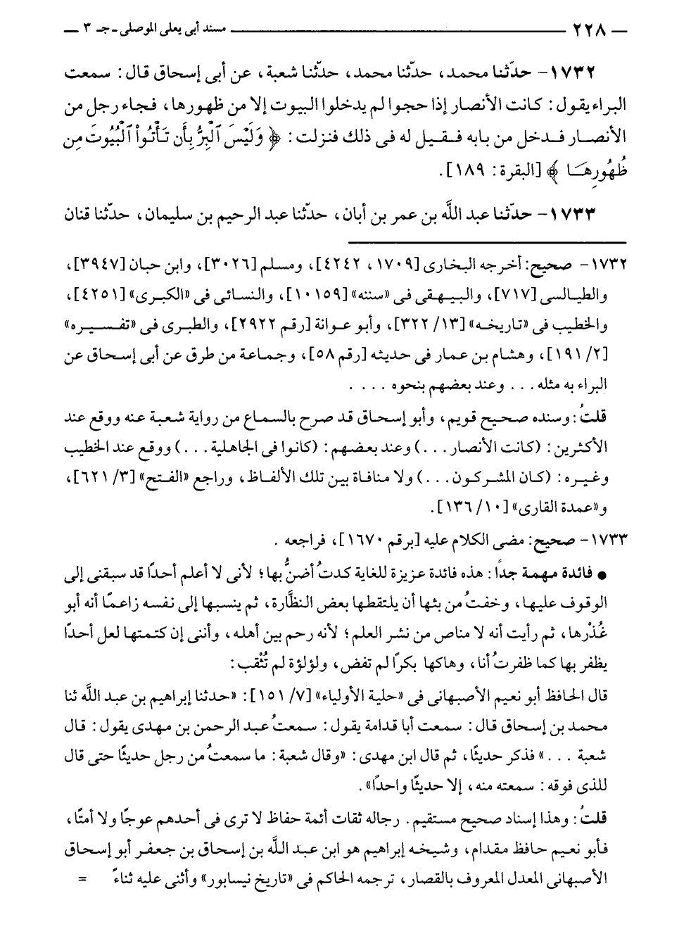 ١٧٣٢ - حدّثنا محمد، حدّثنا محمد، حدّثنا شعبة، عن أبى إسحاق قال: سمعت البراء يقول: كانت الأنصار إذا حجوا لم يدخلوا البيوت إلا من ظهورها، فجاء رجل من الأنصار فدخل من بابه فقيل له في ذلك فنزلت: {وَلَيْسَ الْبِرُّ بِأَنْ تَأْتُوا الْبُيُوتَ مِنْ ظُهُورِهَا} [البقرة: ١٨٩].