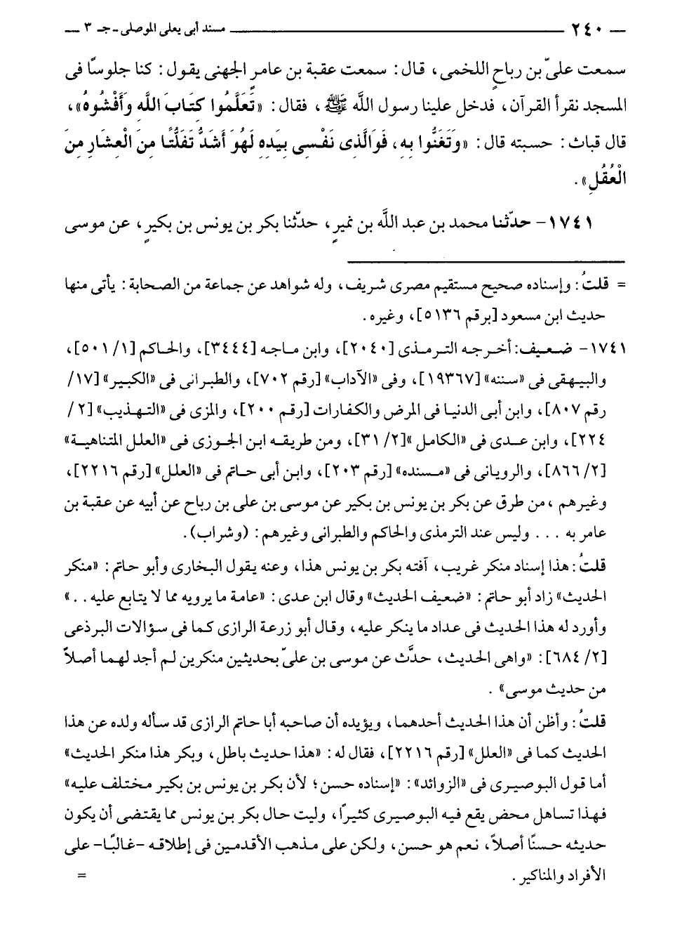 قلتُ: وأظن أن هذا الحديث أحدهما، ويؤيده أن صاحبه أبا حاتم الرازى قد سأله ولده عن هذا الحديث كما في "العلل" [رقم ٢٢١٦]، فقال له: "هذا حديث باطل، وبكر هذا منكر الحديث" أما قول البوصيرى في "الزوائد": "إسناده حسن؛ لأن بكر بن يونس بن بكير مختلف عليه" فهذا تساهل محض يقع فيه البوصيرى كثيرًا، وليت حال بكر بن يونس مما يقتضى أن يكون حديثه حسنًا أصلًا، نعم هو حسن، ولكن على مذهب الأقدمين في إطلاقه - غالبًا - على الأفراد والمناكير.