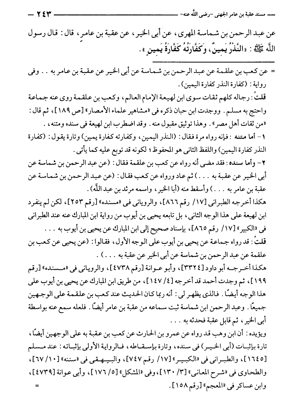 ٢ - وأما سنده: فقد مضى أنه رواه عن كعب بن علقمة فقال: (عن عبد الرحمن بن شماسة عن أبى الخير عن عقبة به ... ) ثم عاد ورواه عن كعب فقال: (عن عبد الرحمن بن شماسة عن عقبة بن عامر به ... ) وأسقط منه (أبا الخير، واسمه مرثد بن عبد الله).