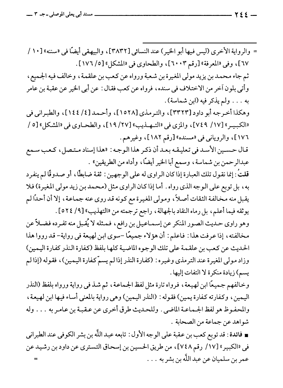 وخالفهم جميعًا ابن لهيعة، فرواه تارة مثل لفظ الجماعة، ثم شذ في رواية ورواه بلفظ (النذر اليمين، وكفارته كفارة يمين) فقوله: (النذر اليمين) وهى رواية بالمعنى أساء فيها ابن لهيعة، والمحفوظ هو لفظ الجماعة الماضى. وللحديث طرق أخرى عن عقبة بن عامر به ... وله شواهد عن جماعة من الصحابة.
