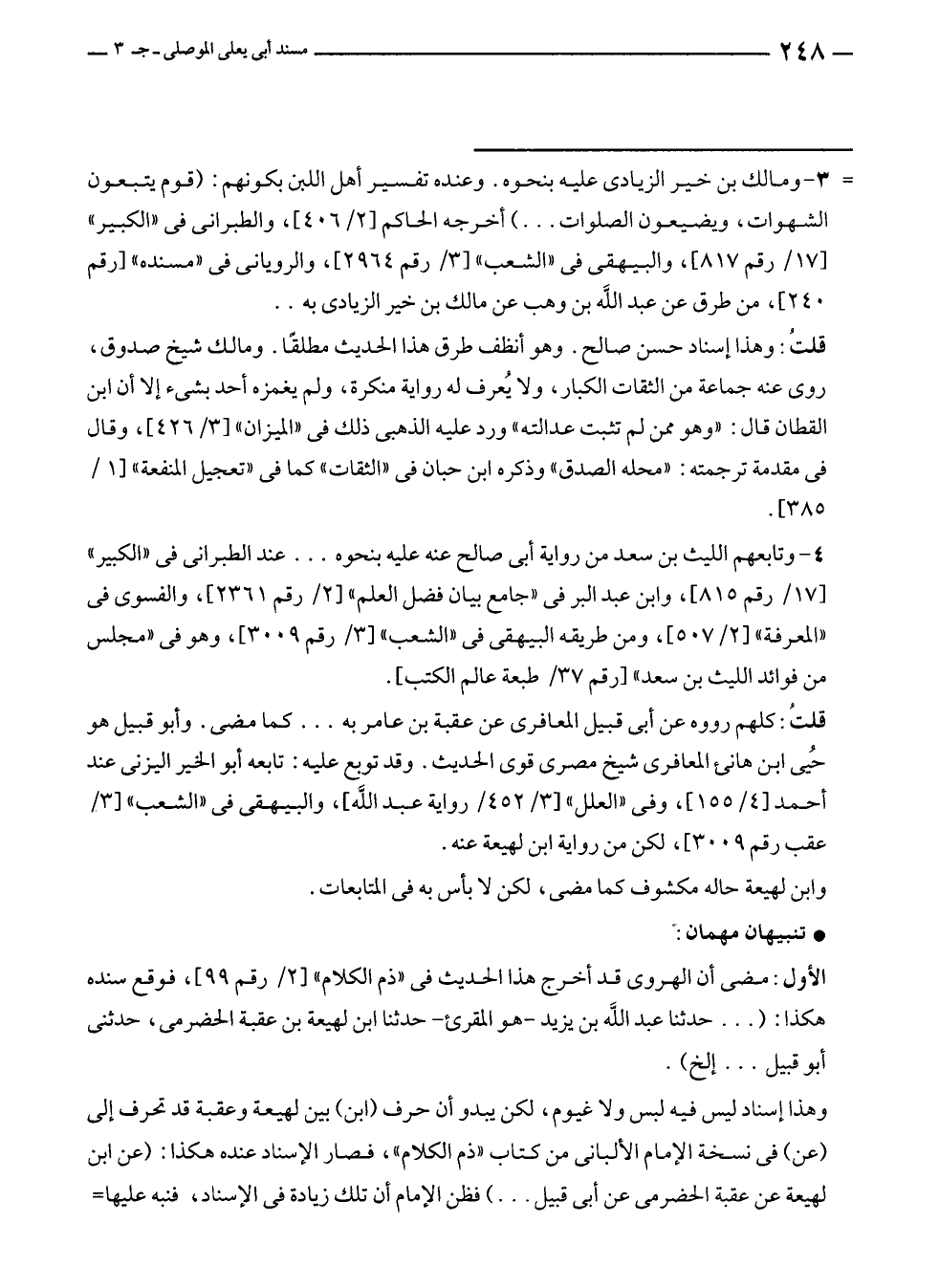 وهذا إسناد ليس فيه لبس ولا غيوم، لكن يبدو أن حرف (ابن) بين لهيعة وعقبة قد تحرف إلى (عن) في نسخة الإمام الألبانى من كتاب "ذم الكلام"، فصار الإسناد عنده هكذا: (عن ابن لهيعة عن عقبة الحضرمى عن أبى قبيل ... ) فظن الإمام أن تلك زيادة في الإسناد، فنبه عليها=