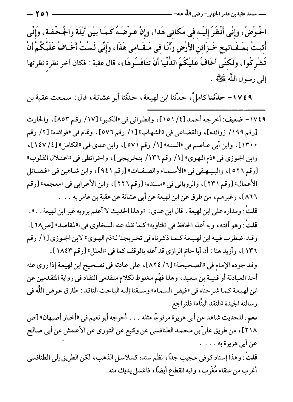 ١٧٤٩ - حدّثنا كامل، حدّثنا ابن لهيعة، حدّثنا أبو عشانة، قال: سمعت عقبة بن