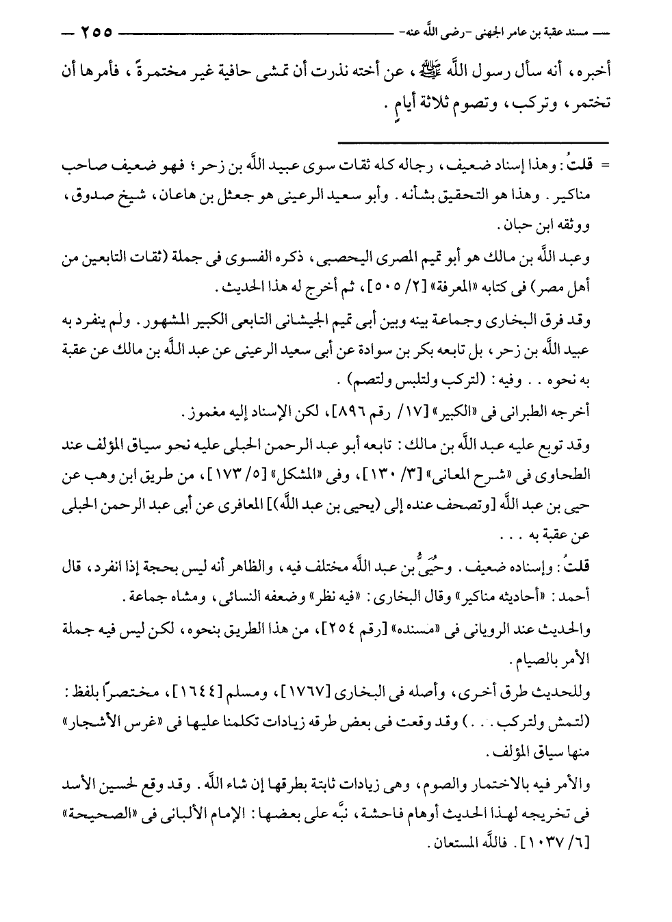 وقد فرق البخارى وجماعة بينه وبين أبى تميم الجيشانى التابعى الكبير المشهور. ولم ينفرد به عبيد الله بن زحر، بل تابعه بكر بن سوادة عن أبى سعيد الرعينى عن عبد الله بن مالك عن عقبة به نحوه .. وفيه: التركب ولتلبس ولتصم).