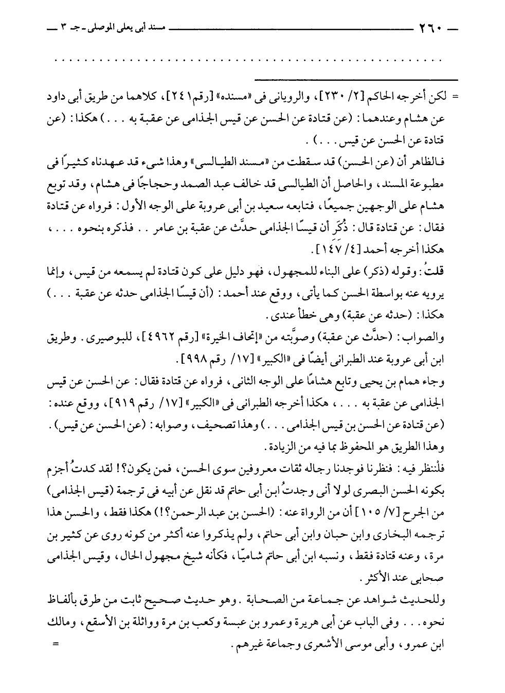 فلْننظر فيه: فنظرنا فوجدنا رجاله ثقات معروفين سوى الحسن، فمن يكون؟! لقد كدتُ أجزم بكونه الحسن البصرى لولا أنى وجدتُ ابن أبى حاتم قد نقل عن أبيه في ترجمة (قيس الجذامى) من الجرح [٧/ ١٠٥] أن من الرواة عنه: (الحسن بن عبد الرحمن؟!) هكذا فقط، والحسن هذا ترجمه البخارى وابن حبان وابن أبى حاتم، ولم يذكروا عنه أكثر من كونه روى عن كثير بن مرة، وعنه قتادة فقط، ونسبه ابن أبى حاتم شاميّا، فكأنه شيخ مجهول الحال، وقيس الجذامى صحابى عند الأكثر.