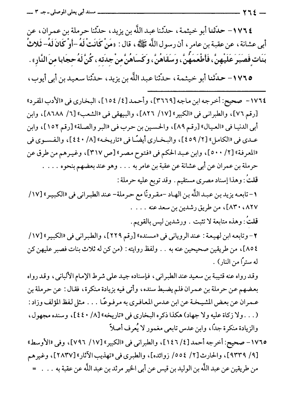 ١٧٦٤ - صحيح: أخرجه ابن ماجه [٣٦٦٩]، وأحمد [٤/ ١٥٤]، البخارى في "الأدب المفرد" [رقم ٧٦]، والطبراني في "الكبير" [١٧/ ٨٢٦]، والبيهقي في "الشعب" [٦/ ٨٦٨٨]، وابن أبى الدنيا في "العيال" [رقم ٨٩]، والحسين بن حرب في "البر والصلة" [رقم ١٥٢]، وابن عدى في "الكامل" [٢/ ٤٥٩]، والبخارى أيضًا في "تاريخه" [٨/ ٤٤٠]، والفسوى في "المعرفة" [٢/ ٥٠٠]، وابن عبد الحكم في "فتوح مصر" [ص ٣١٧]، وغيرهم من طرق عن حرملة بن عمران عن أبى عشانة عن عقبة بن عامر به ... وهو عند بعضهم بنحوه ....
