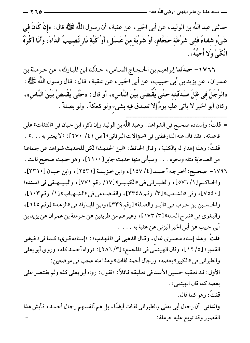 ١٧٦٦ - صحيح: أخرجه أحمد [٤/ ١٤٧]، وابن خزيمة [٢٤٣١]، وابن حبان [٣٣١٠]، والحاكم [١/ ٥٧٦]، والطبراني في "الكبير" [١٧/ رقم ٧٧١]، والبيهقي في "سنده" [٧٥٤٠]، وفى "الشعب" [٣/ رقم ٣٣٤٨]، والقضاعى في "الشهاب" [١/ رقم ١٠٣]، والحسين بن حرب في "البر والصلة" [رقم ٣٣٩]، وابن المبارك في "الزهد" [رقم ٦٤٥]، والبغوى في "شرح السنة" [٣/ ١٧٣]، وغيرهم من طريقين عن حرملة بن عمران عن يزيد بن أبى حبيب عن أبى الخير اليزنى عن عقبة به ....