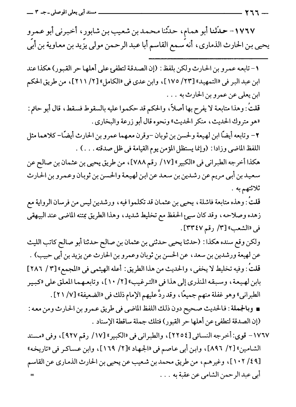 • وبالجملة: فالحديث صحيح دون ذلك اللفظ الماضى في طريق عمرو بن الحارث ومن معه: (إن الصدقة لتطفئ عن أهلها حر القبور) فتلك جملة ساقطة الإسناد.