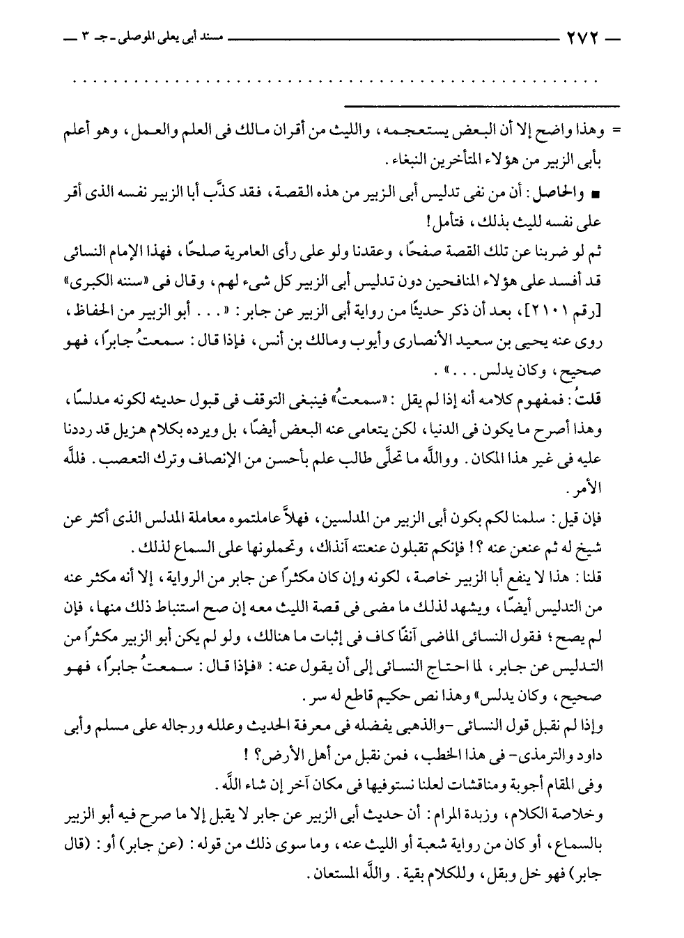 وخلاصة الكلام، وزبدة المرام: أن حديث أبى الزبير عن جابر لا يقبل إلا ما صرح فيه أبو الزبير بالسماع، أو كان من رواية شعبة أو الليث عنه، وما سوى ذلك من قوله: (عن جابر) أو: (قال جابر) فهو خل وبقل، وللكلام بقية. واللَّه المستعان.