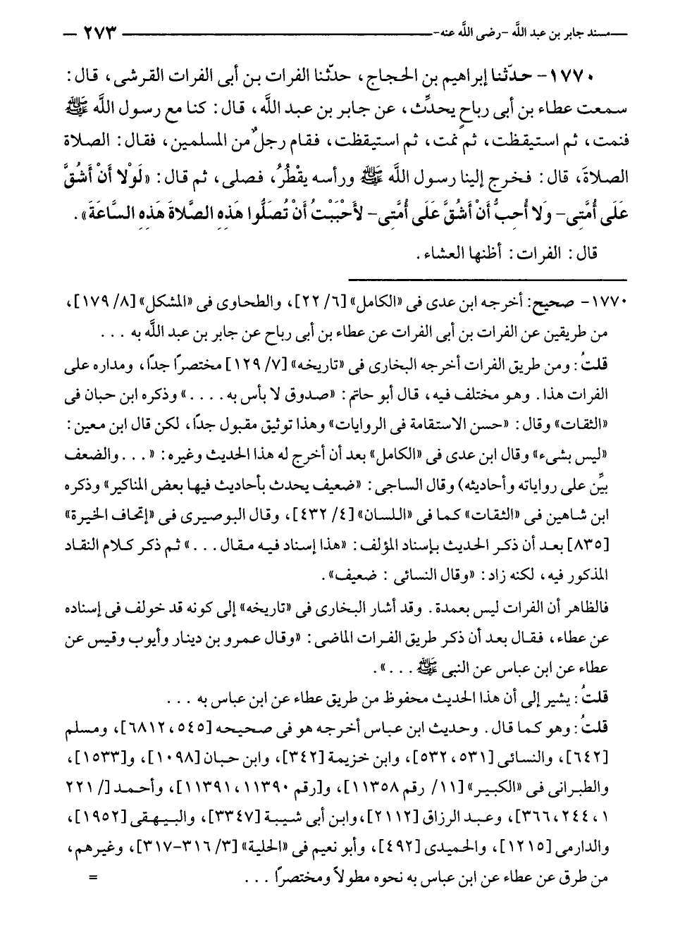 ١٧٧٠ - حدّثنا إبراهيم بن الحجاج، حدّثنا الفرات بن أبى الفرات القرشى، قال: سمعت عطاء بن أبى رباحٍ يحدِّث، عن جابر بن عبد الله، قال: كنا مع رسول الله - صلى الله عليه وسلم - فنمت، ثم استيقظت، ثم نمت، ثم استيقظت، فقام رجلٌ من المسلمين، فقال: الصلاة الصلاةَ، قال: فخرج إلينا رسول الله - صلى الله عليه وسلم - ورأسه يقْطُرُ، فصلى، ثم قال: "لَوْلا أَنْ أَشُقَّ عَلَى أُمَّتِى - وَلا أُحِبُّ أَنْ أَشُقَّ عَلَى أُمَّتِى - لأَحْبَبْتُ أَنْ تُصَلُّوا هَذِهِ الصَّلاةَ هَذِهِ السَّاعَةَ".