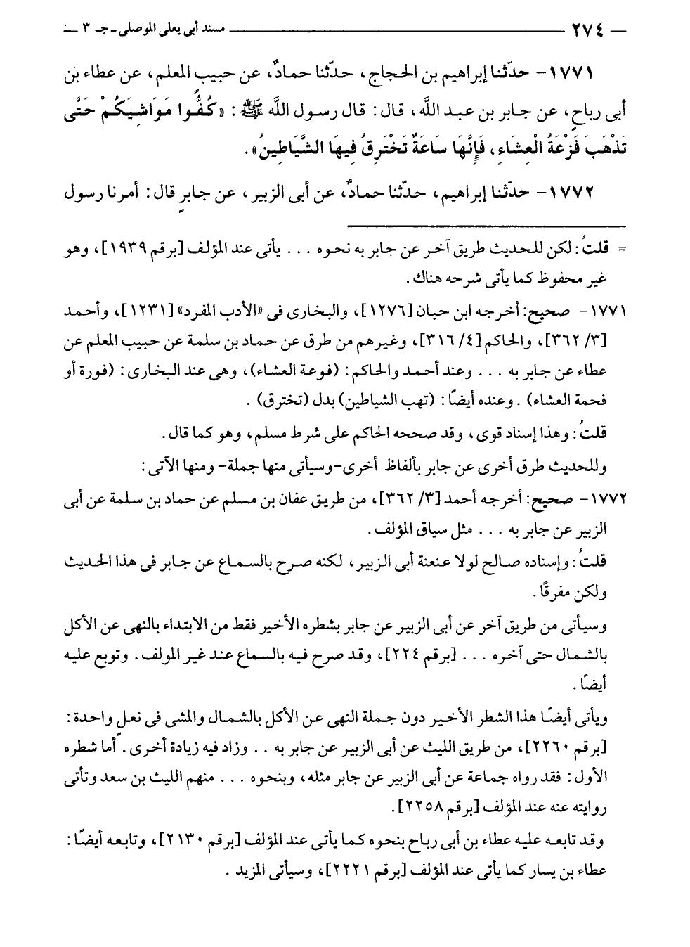 ١٧٧١ - حدّثنا إبراهيم بن الحجاج، حدّثنا حمادٌ، عن حبيبٍ المعلم، عن عطاء بن أبى رباحٍ، عن جابر بن عبد الله، قال: قال رسول الله - صلى الله عليه وسلم -: "كُفُّوا مَوَاشِيَكُمْ حَتَّى تَذْهَبَ فَزْعَةُ الْعِشَاءِ، فَإِنَّهَا سَاعَةٌ تَخْتَرِقُ فِيهَا الشَّيَاطِينُ".