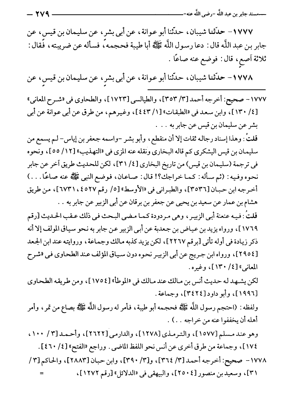 ١٧٧٧ - حدّثنا شيبان، حدّثنا أبو عوانة، عن أبى بشر، عن سليمان بن قيسٍ، عن جابر بن عبد الله قال: دعا رسول الله - صلى الله عليه وسلم - أبا طيبة فحجمه، فسأله عن ضريبته، فقال: ثلاثة آصعٍ، قال: فوضع عنه صاعًا.