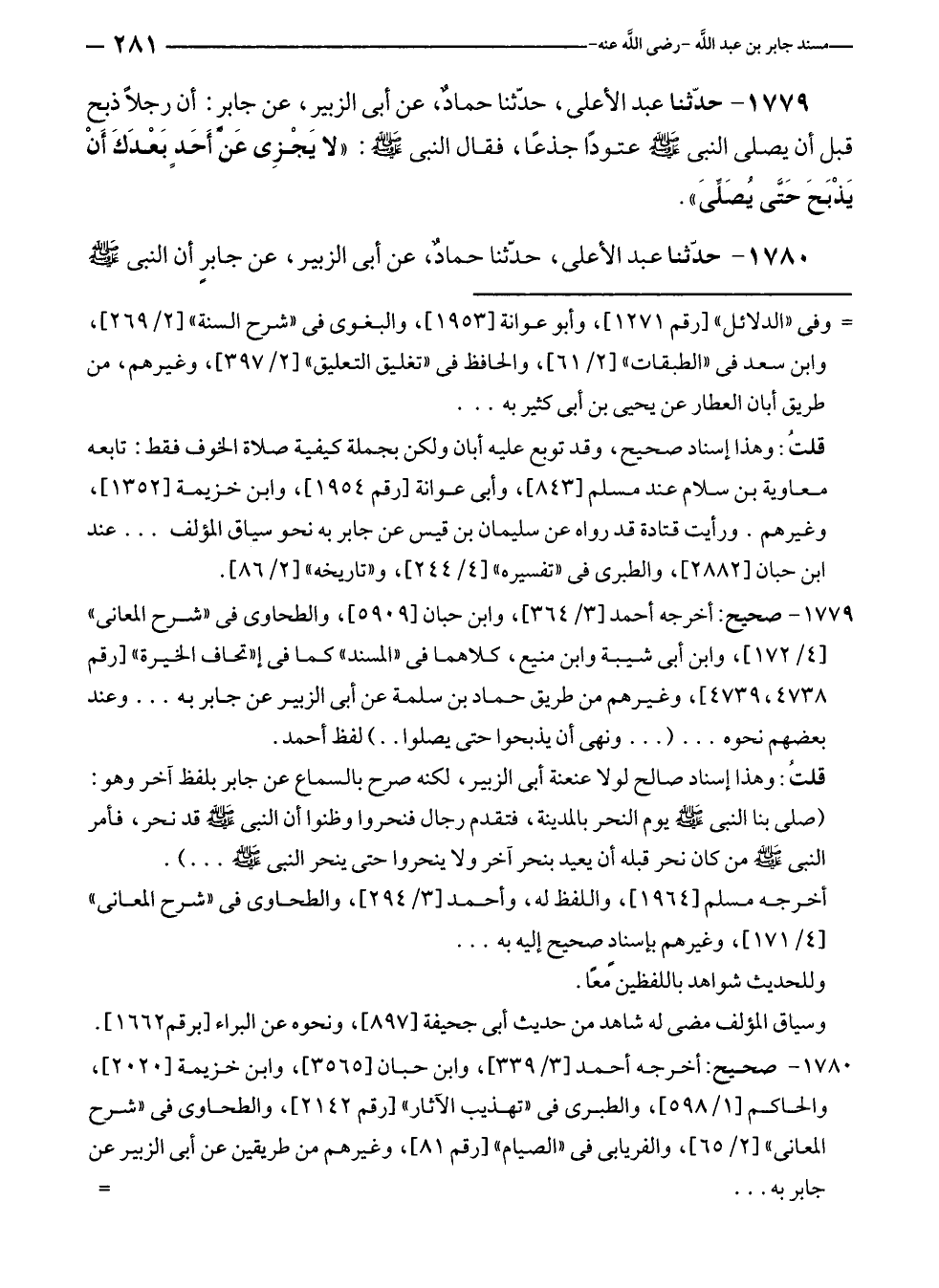 ١٧٧ - صحيح: أخرجه أحمد [٣/ ٣٦٤]، وابن حبان [٥٩٠٩]، والطحاوى في "شرح المعانى" [٤/ ١٧٢]، وابن أبى شيبة وابن منيع، كلاهما في "المسند" كما في "إتحاف الخيرة" [رقم ٤٧٣٨، ٤٧٣٩]، وغيرهم من طريق حماد بن سلمة عن أبى الزبير عن جابر به ... وعند بعضهم نحوه ... ( ... ونهى أن يذبحوا حتى يصلوا .. ) لفظ أحمد.