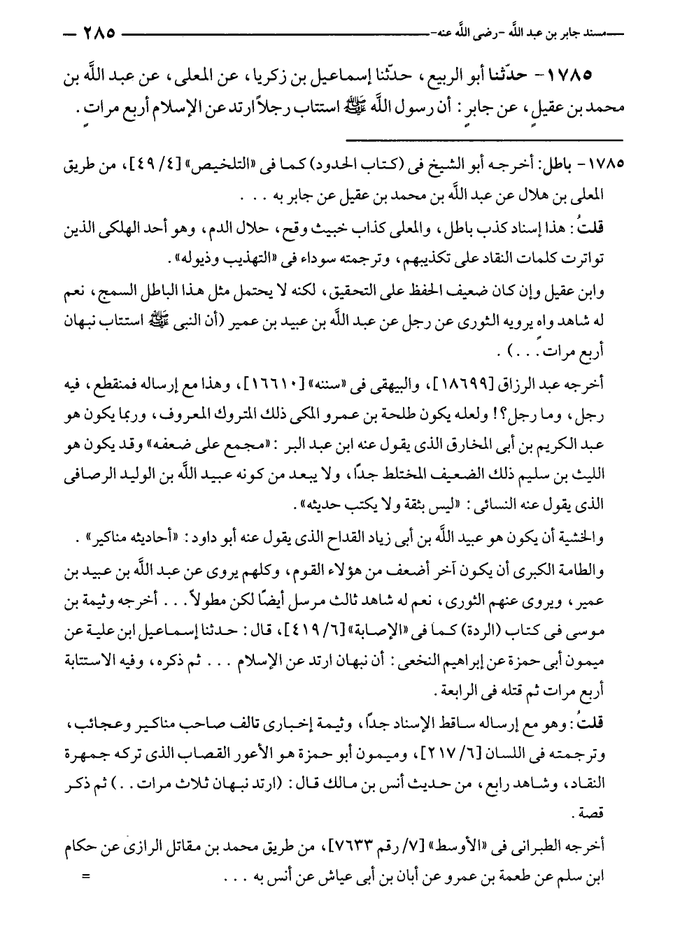 ١٧٨٥ - حدّثنا أبو الربيع، حدّثنا إسماعيل بن زكريا، عن المعلى، عن عبد الله بن محمد بن عقيلٍ، عن جابرٍ: أن رسول الله - صلى الله عليه وسلم - استتاب رجلًا ارتد عن الإسلام أربع مراتٍ.