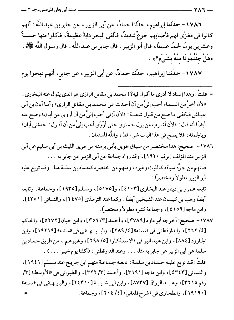 ١٧٨٦ - حدّثنا إبراهيم، حدّثنا حمادٌ، عن أبى الزبير، عن جابر بن عبد الله: أنهم كانوا في مغزًى لهم فأصابهم جوعٌ شديدٌ، فألقى البحر دابةً عظيمةً، فأكلوا منها خمسةً وعشرين يومًا لحمًا عبيطًا، قال أبو الزبير: قال جابر بن عبد الله: قال رسول الله - صلى الله عليه وسلم -: "هَلْ جِئْتمُونَا مِنْهُ بِشَىْءٍ؟ ".