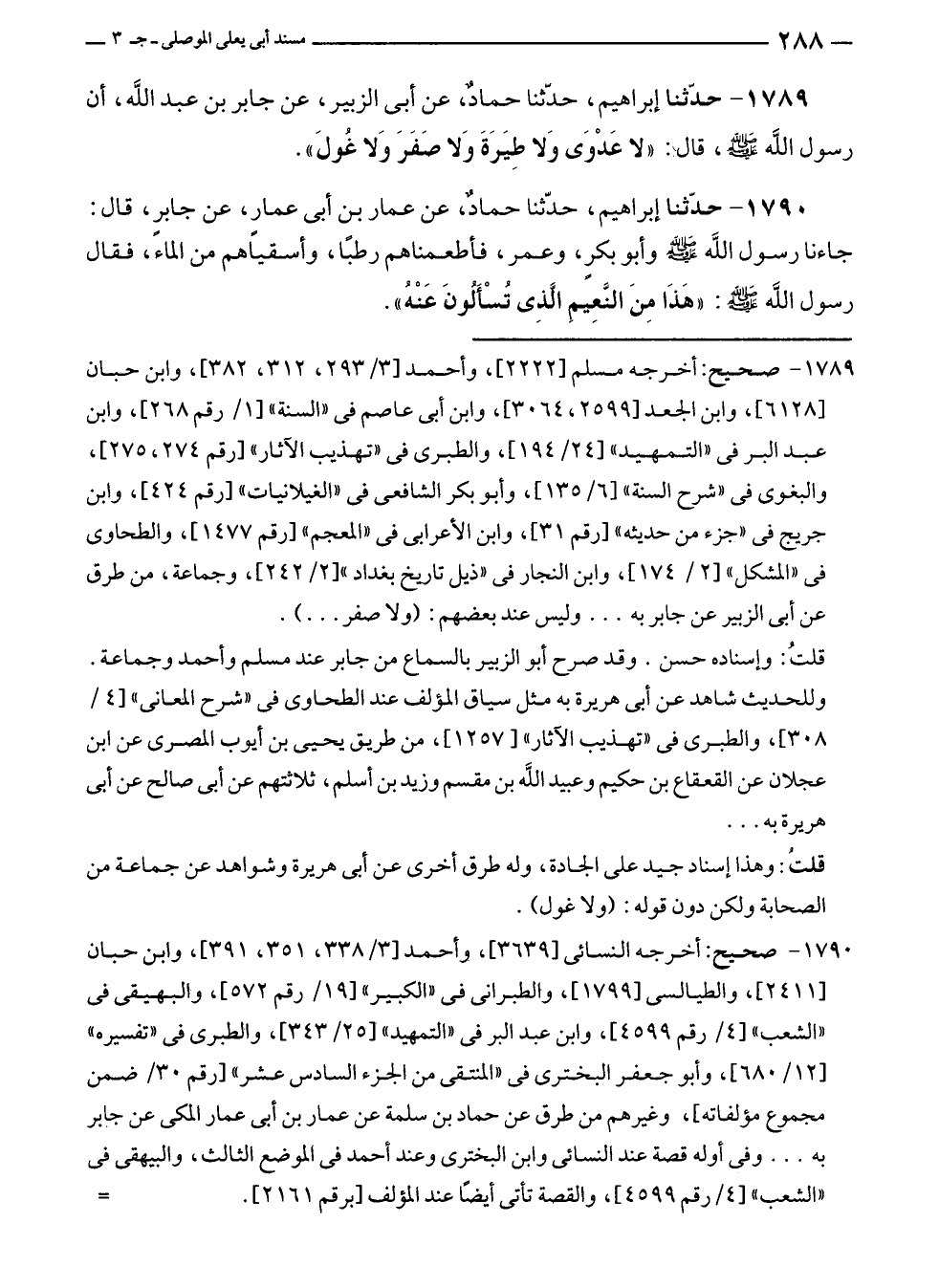١٧٨٩ - صحيح: أخرجه مسلم [٢٢٢٢]، وأحمد [٣/ ٢٩٣، ٣١٢، ٣٨٢]، وابن حبان [٦١٢٨]، وابن الجعد [٢٥٩٩، ٣٠٦٤]، وابن أبى عاصم في "السنة" [١/ رقم ٢٦٨]، وابن عبد البر في "التمهيد" [٣٤/ ١٩٤]، والطبرى في "تهذيب الآثار" [رقم ٢٧٤، ٢٧٥]، والبغوى في "شرح السنة" [٦/ ١٣٥]، وأبو بكر الشافعي في "الغيلانيات" [رقم ٤٢٤]، وابن جريج في "جزء من حديثه" [رقم ٣١]، وابن الأعرابى في "المعجم" [رقم ١٤٧٧]، والطحاوى في "المشكل" [٢/ ١٧٤]، وابن النجار في "ذيل تاريخ بغداد" [٢/ ٢٤٢]، وجماعة، من طرق عن أبى الزبير عن جابر به ... وليس عند بعضهم: (ولا صفر ... ).