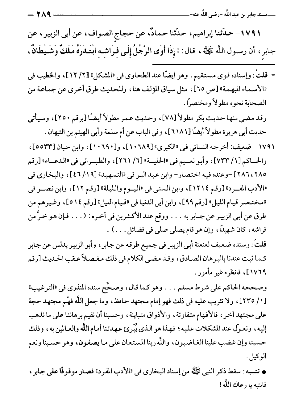 ١٧٩١ - حدّثنا إبراهيم، حدّثنا حماد، عن حجاج الصواف، عن أبى الزبير، عن جابرٍ، أن رسول الله - صلى الله عليه وسلم -، قال: "إذَا أَوَى الرَّجُلُ إِلَى فِرَاشِهِ ابْتَدَرَهُ مَلَكٌ وَشَيْطَانٌ،