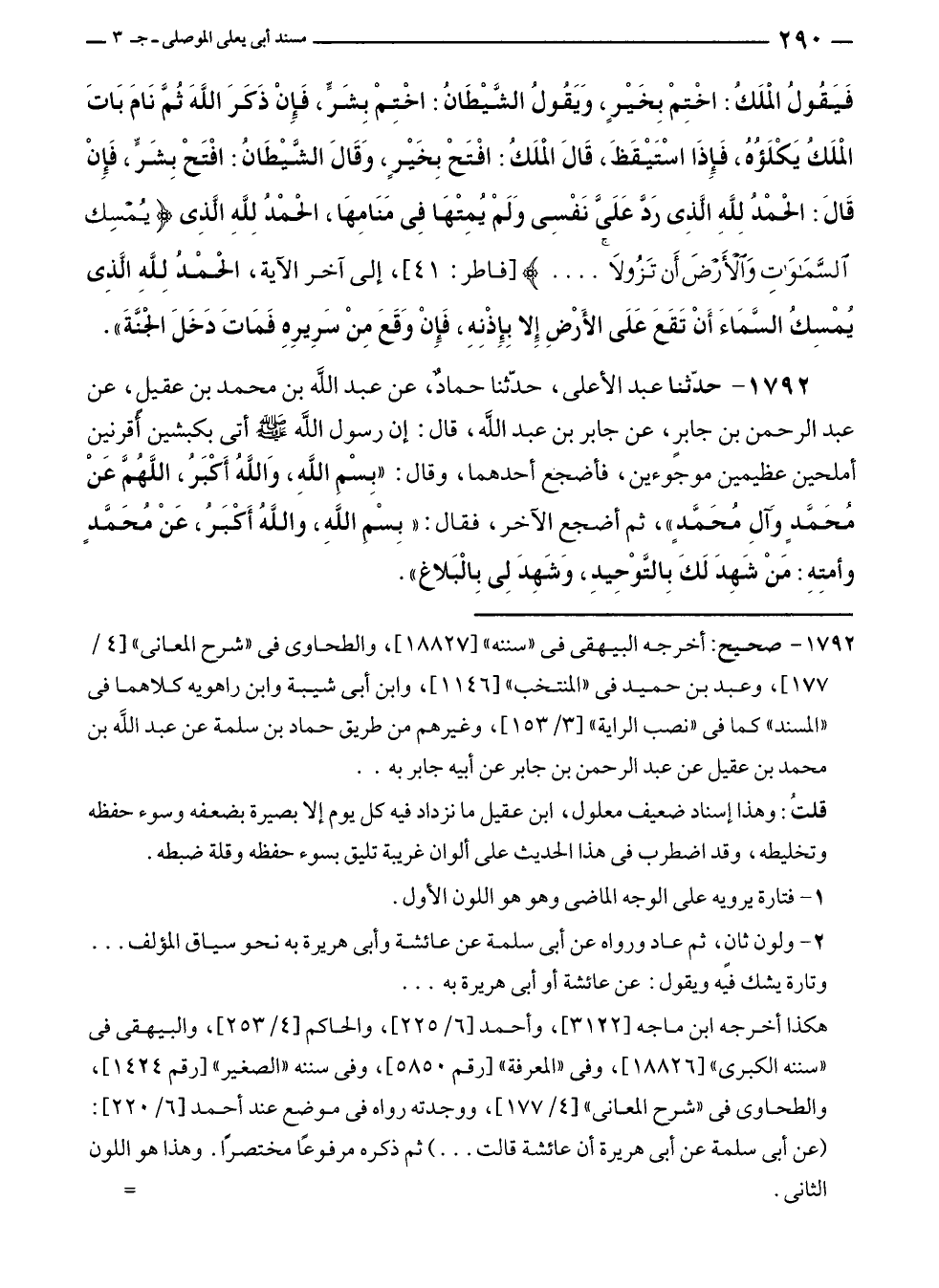 ١٧٩٢ - صحيح: أخرجه البيهقى في "سننه" [١٨٨٢٧]، والطحاوى في "شرح المعانى" [٤/ ١٧٧]، وعبد بن حميد في "المنتخب" [١١٤٦]، وابن أبى شيبة وابن راهويه كلاهما في "المسند" كما في "نصب الراية" [٣/ ١٥٣]، وغيرهم من طريق حماد بن سلمة عن عبد الله بن محمد بن عقيل عن عبد الرحمن بن جابر عن أبيه جابر به ..