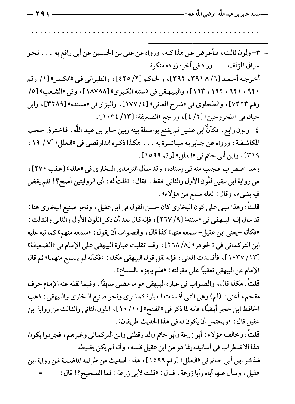٤ - ولون رابع، فكأنَّ ابن عقيل لم يقنع بواسطة بينه وبين جابر بن عبد الله، فاخترق حجب المكاشفة، ورواه عن جابر به مباشرة به .. ، هكذا ذكره الدارقطنى في "العلل" [٧/ ١٩، ٣١٩]، وابن أبى حاتم في "العلل" [رقم ١٥٩٩].