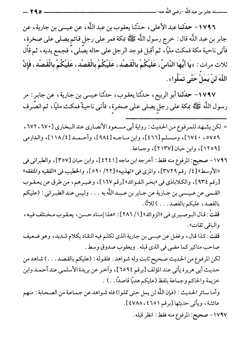 ١٧٩٦ - حدّثنا عبد الأعلى، حدّثنا يعقوب بن عبد الله، عن عيسى بن جارية، عن جابر بن عبد الله قال: خرج رسول الله - صلي الله عليه وسلم - بمكة فمر على رجلٍ قائمٍ يصلى على صخرة، فأتى ناحية مكة فمكث مليّا، ثم أقبل فوجد الرجل على حاله يصلى، فجمع يديه، ثم قال ثلاث مراتٍ: "يَا أَيُّهَا النَّاسُ، عَلَيْكُمْ بِالْقَصْدِ، عَلَيْكُمْ بِالْقَصْدِ، عَلَيْكُمْ بِالْقَصْدِ، فَإِنَّ اللَّهَ لَنْ يَمَلَّ حَتَّى تَمَلُّوا".