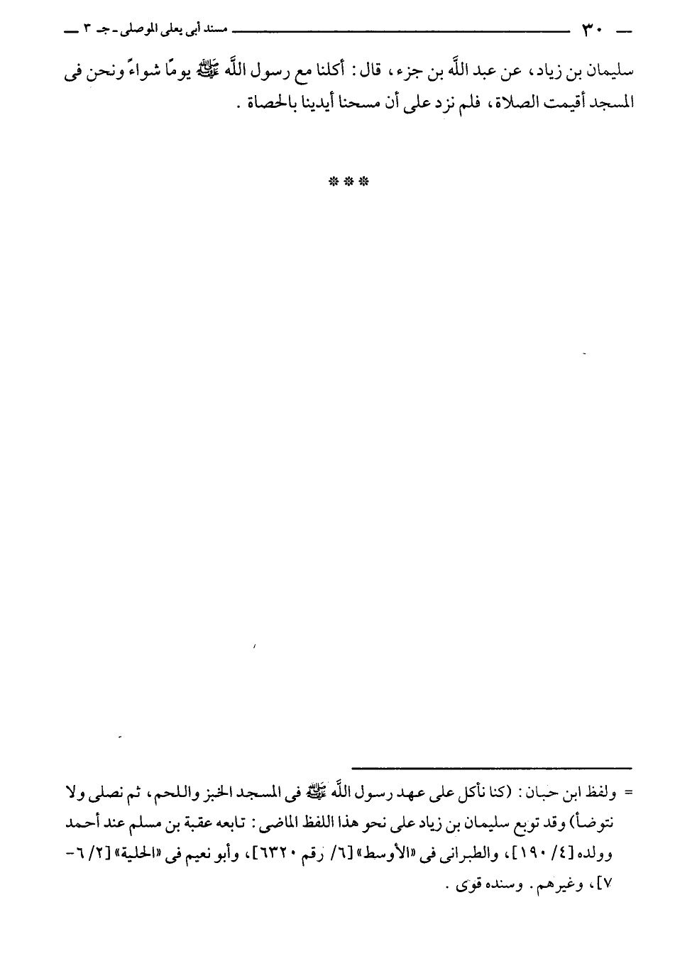 سليمان بن زياد، عن عبد الله بن جزء، قال: أكلنا مع رسول الله - صلى الله عليه وسلم - يومًا شواءً ونحن في المسجد أقيمت الصلاة، فلم نزد على أن مسحنا أيدينا بالحصاة.