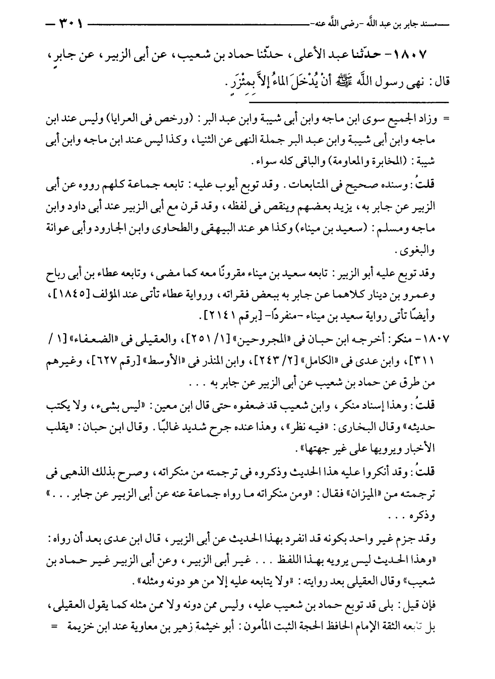 ١٨٠٧ - حدّثنا عبد الأعلى، حدّثنا حماد بن شعيب، عن أبى الزبير، عن جابرٍ، قال: نهى رسول الله - صلى الله عليه وسلم - أنْ يُدْخَلَ الماءُ إلَّا بِمِئْزَرٍ.