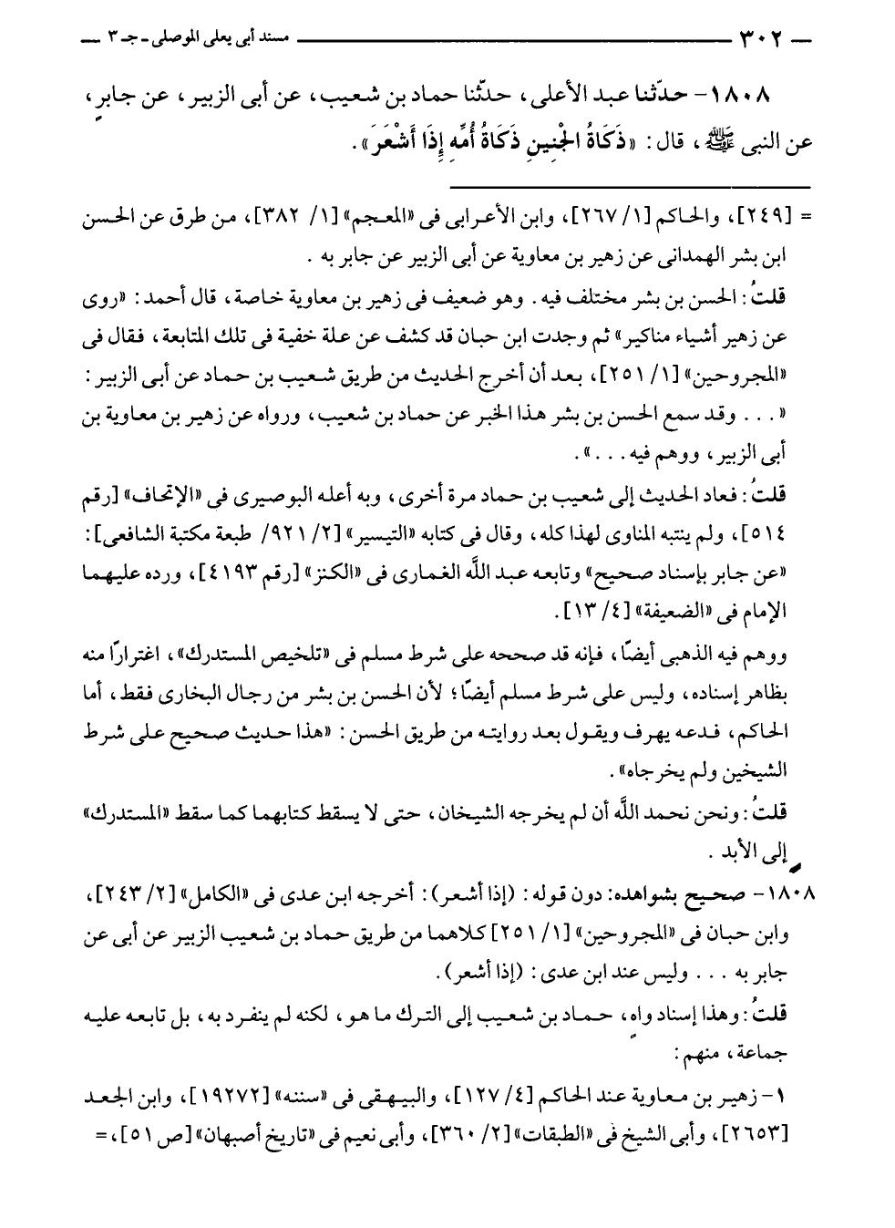 ١٨٠٨ - حدّثنا عبد الأعلى، حدّثنا حماد بن شعيب، عن أبى الزبير، عن جابرٍ، عن النبي - صلي الله عليه وسلم -، قال: "ذَكَاةُ الجنِينِ ذَكَاة أمِّهِ إِذَا أَشْعَرَ".