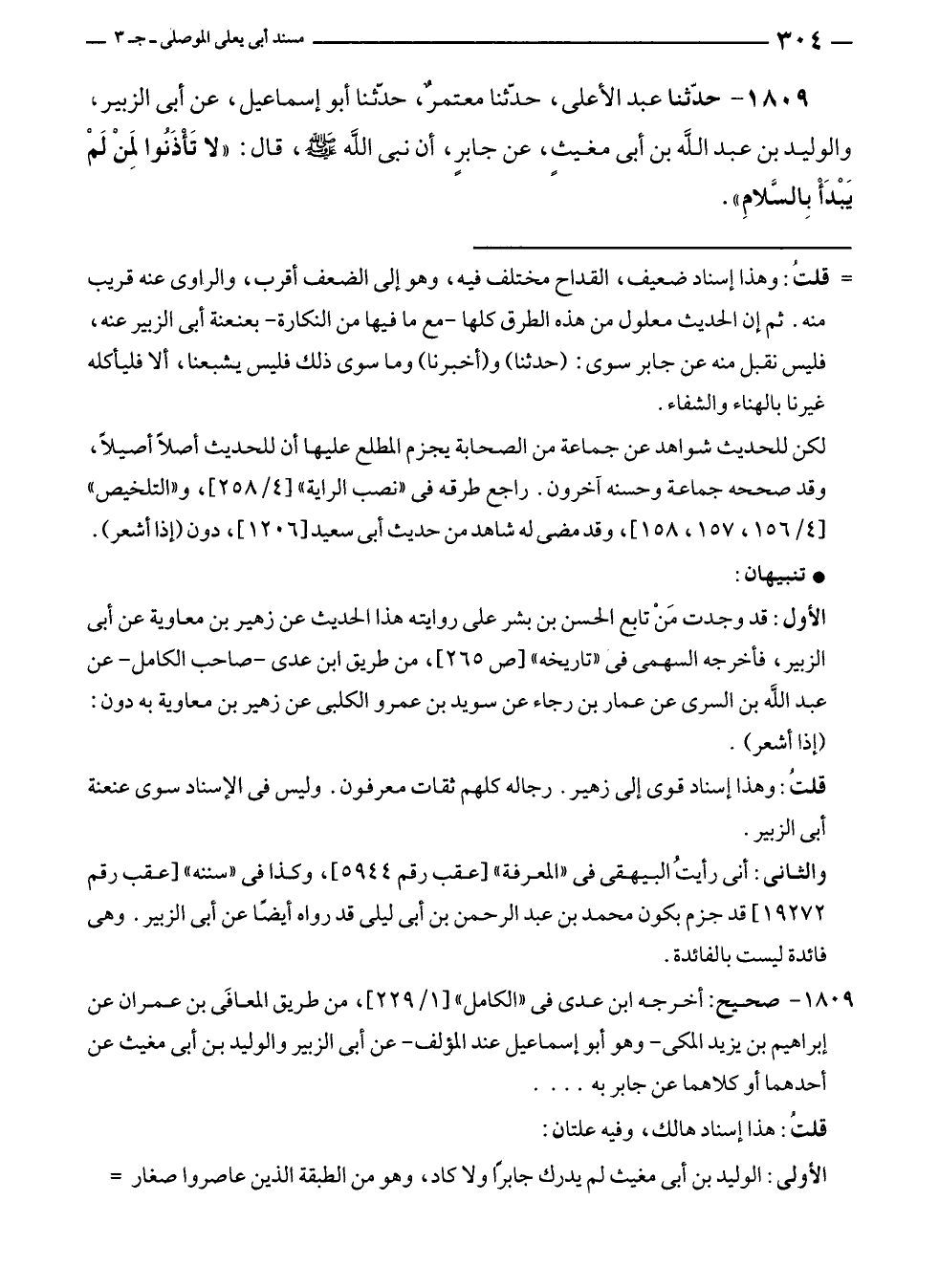 ١٨٠٩ - حدّثنا عبد الأعلى، حدّثنا معتمرٌ، حدّثنا أبو إسماعيل، عن أبى الزبير، والوليد بن عبد الله بن أبى مغيثٍ، عن جابرٍ، أن نبى الله - صلى الله عليه وسلم -، قال: "لا تَأْذَنُوا لمِنْ لَمْ يَبْدَأْ بِالسَّلامِ".