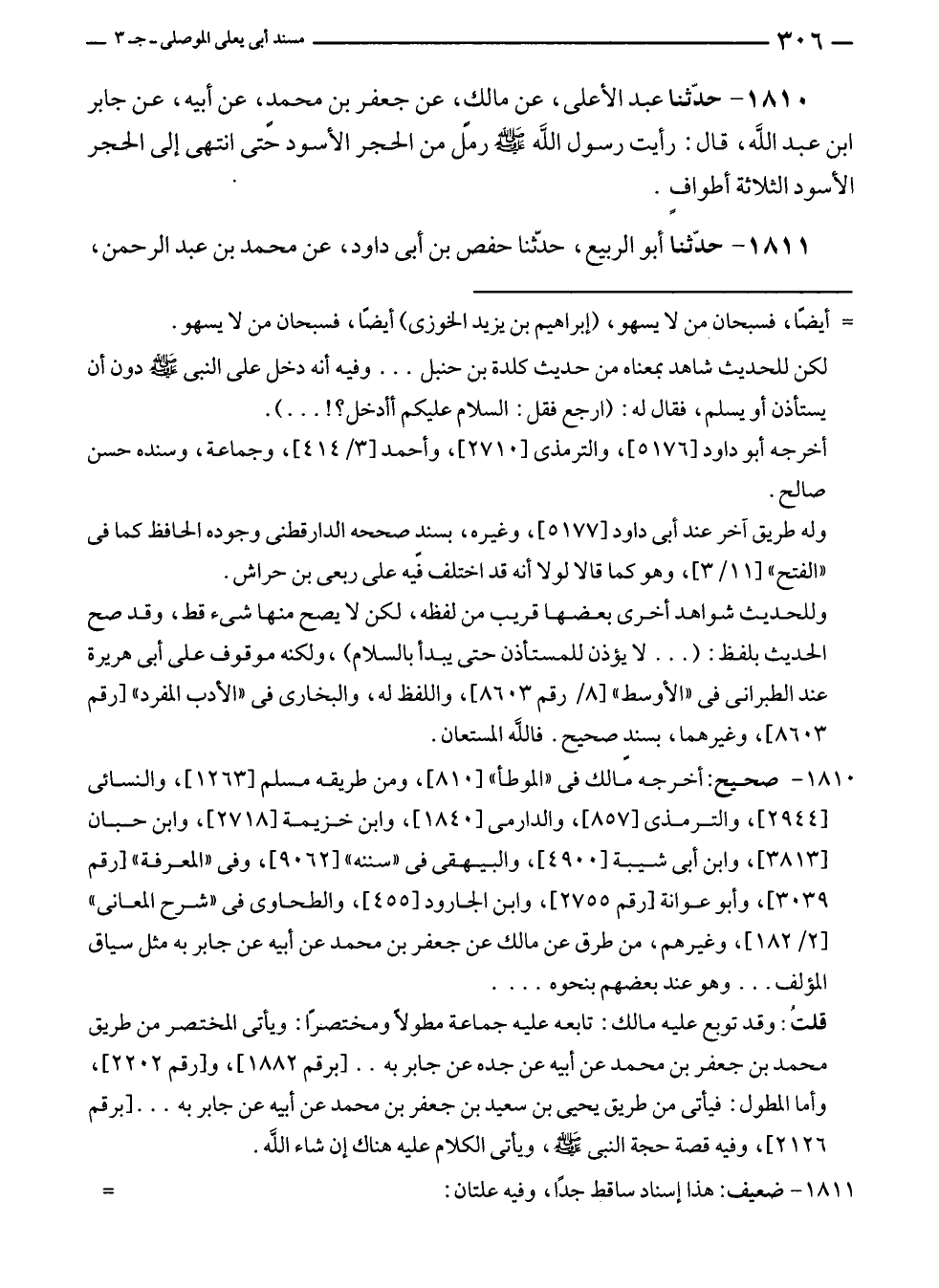 ١٨١٠ - حدّثنا عبد الأعلى، عن مالك، عن جعفر بن محمد، عن أبيه، عن جابرٍ بن عبد الله، قال: رأيت رسول الله - صلى الله عليه وسلم - رمل من الحجر الأسود حتى انتهى إلى الحجر الأسود الثلاثة أطوافٍ.