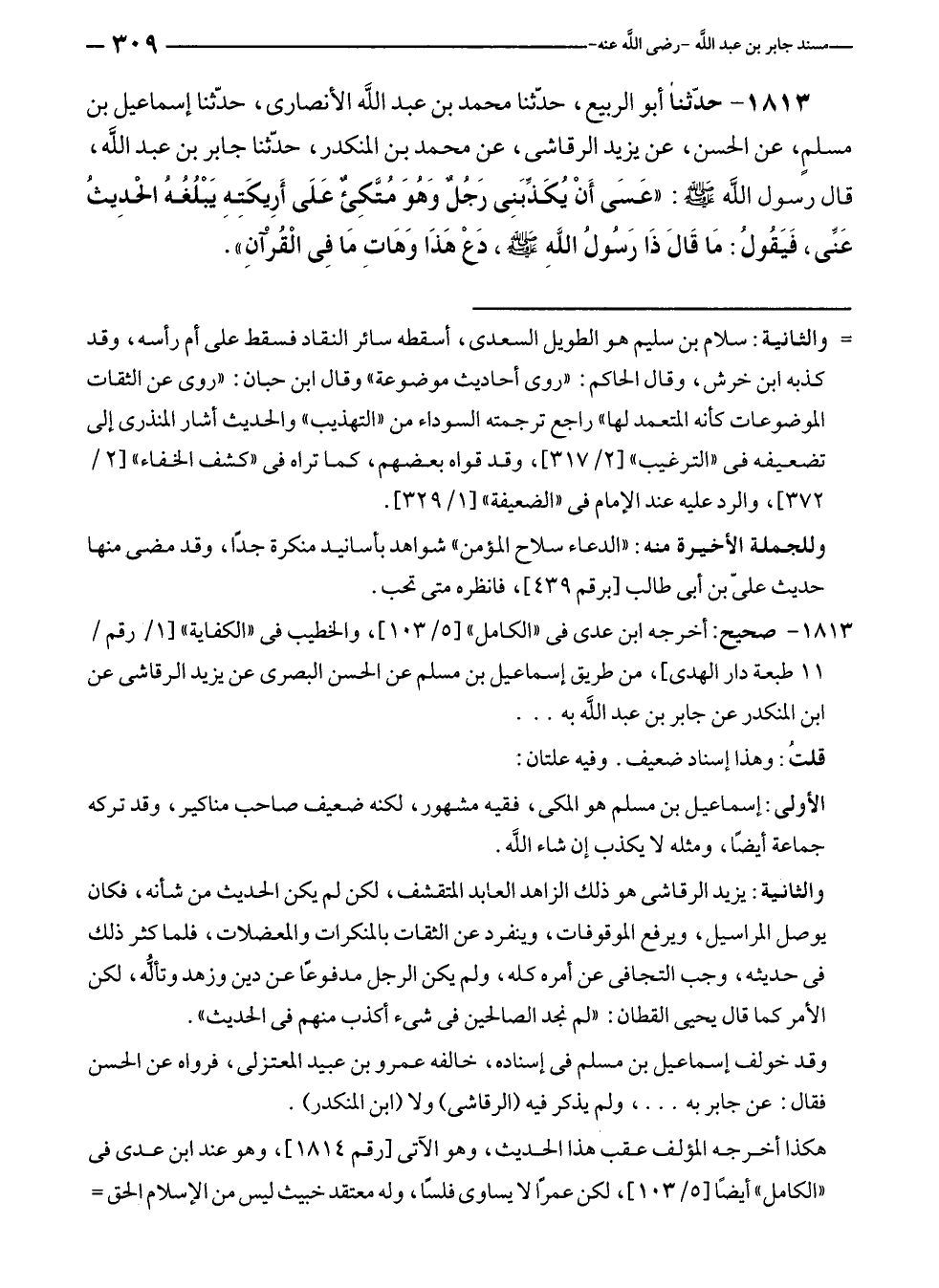 ١٨١٣ - حدّثنا أبو الربيع، حدّثنا محمد بن عبد الله الأنصارى، حدّثنا إسماعيل بن مسلمٍ، عن الحسن، عن يزيد الرقاشى، عن محمد بن المنكدر، حدّثنا جابر بن عبد الله، قال رسول الله - صلي الله عليه وسلم -: "عَسَى أَنْ يُكَذِّبَنِى رَجُلٌ وَهُوَ مُتَّكِئ عَلَى أَرِيكَتِهِ يَبْلُغُهُ الحدِيثُ عَنِّي، فَيَقُولُ: مَا قَالَ ذَا رَسُولُ اللَّهِ - صلى الله عليه وسلم -، دَعْ هَذَا وَهَاتِ مَا فِي الْقُرْآنِ".