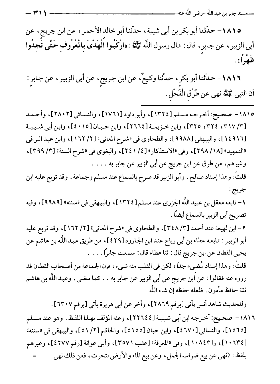 ١٨١٥ - صحيح: أخرجه مسلم [١٣٢٤]، وأبو داود [١٧٦١]، والنسائى [٢٨٠٢]، وأحمد [٣/ ٣١٧، ٣٢٤، ٣٢٥]، وابن خزيمة [٢٦٦٤]، وابن حبان [٤٠١٥]، وابن أبى شيبة [١٤٩١٦]، والبيهقى [٩٩٨٨]، والطحاوى في "شرح المعانى" [٢/ ١٦٢]، وابن عبد البر في "التمهيد" [١٨/ ٢٩٨]، وفى "الاستذكار" [٤/ ٢٤١]، والبغوى في "شرح السنة" [٣/ ٣٩٩]، وغيرهم، من طرق عن ابن جريج عن أبى الزبير عن جابر به ....
