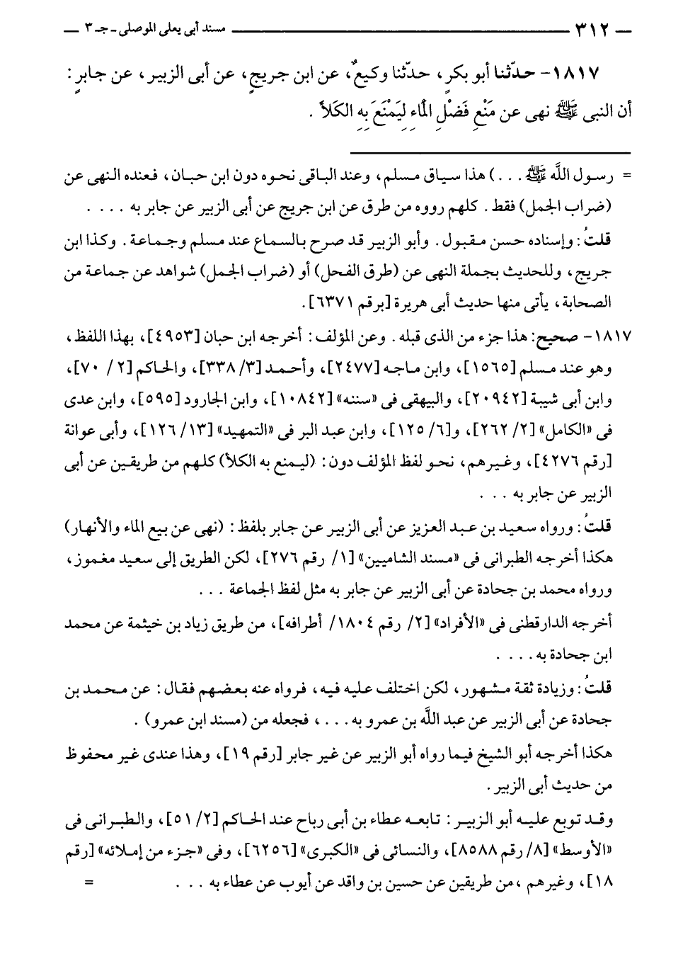 ١٨١٧ - حدّثنا أبو بكرٍ، حدّثنا وكيعٌ، عن ابن جريجٍ، عن أبى الزبير، عن جابرٍ: أن النبي - صلي الله عليه وسلم - نهى عن مَنع فَضْلِ الماءِ لِيَمْنَعَ بِهِ الكَلأَ.