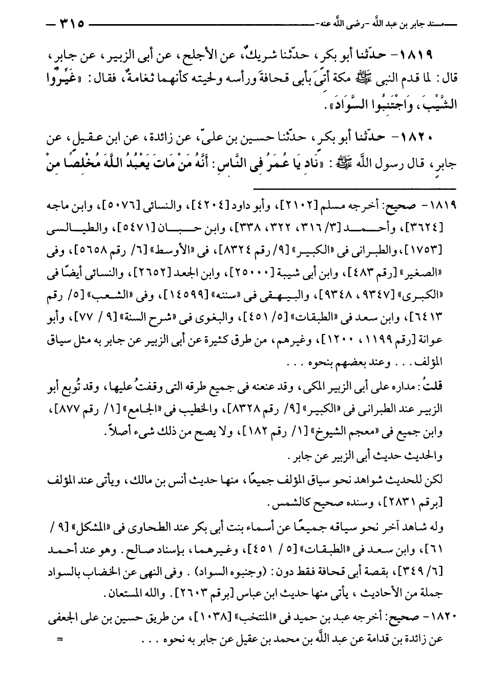 ١٨١٩ - حدّثنا أبو بكرٍ، حدّثنا شريكٌ، عن الأجلح، عن أبى الزبير، عن جابرٍ، قال: لما قدم النبي - صلى الله عليه وسلم - مكة أتِى بأبى قحافةَ ورأسه ولحيته كأنهما ثغامةٌ، فقال: "غَيِّروا الشَّيْبَ، وَاجْتَنِبُوا السَّوَادَ".
