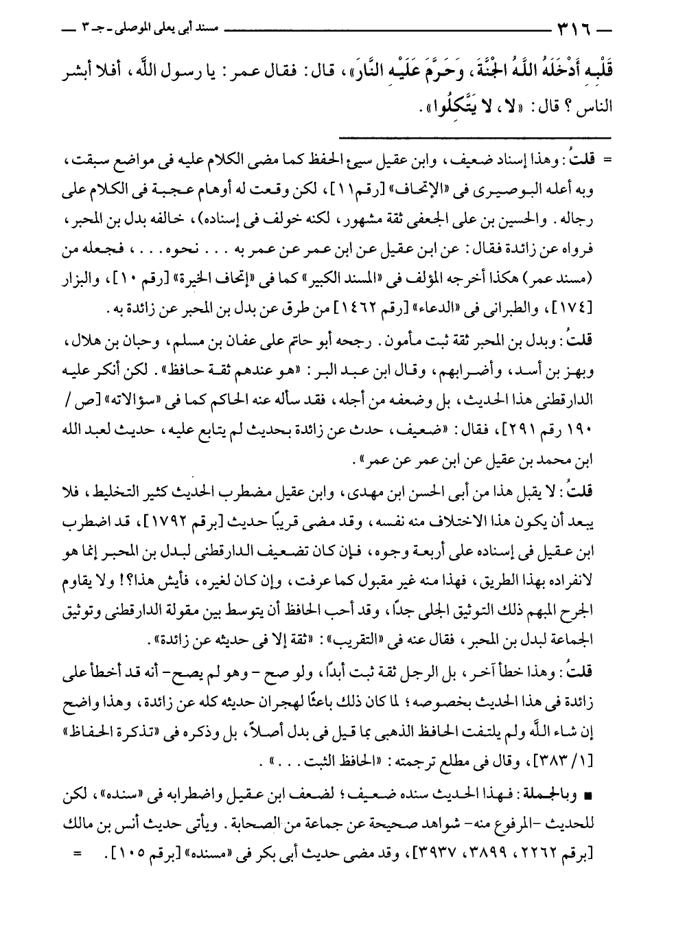 قلتُ: وبدل بن المحبر ثقة ثبت مأمون. رجحه أبو حاتم على عفان بن مسلم، وحبان بن هلال، وبهز بن أسد، وأضرابهم، وقال ابن عبد البر: "هو عندهم ثقة حافظ". لكن أنكر عليه الدارقطنى هذا الحديث، بل وضعفه من أجله، فقد سأله عنه الحاكم كما في "سؤالاته" [ص/ ١٩٠ رقم ٢٩١]، فقال: "ضعيف، حدث عن زائدة بحديث لم يتابع عليه، حديث لعبد الله بن محمد بن عقيل عن ابن عمر عن عمر".