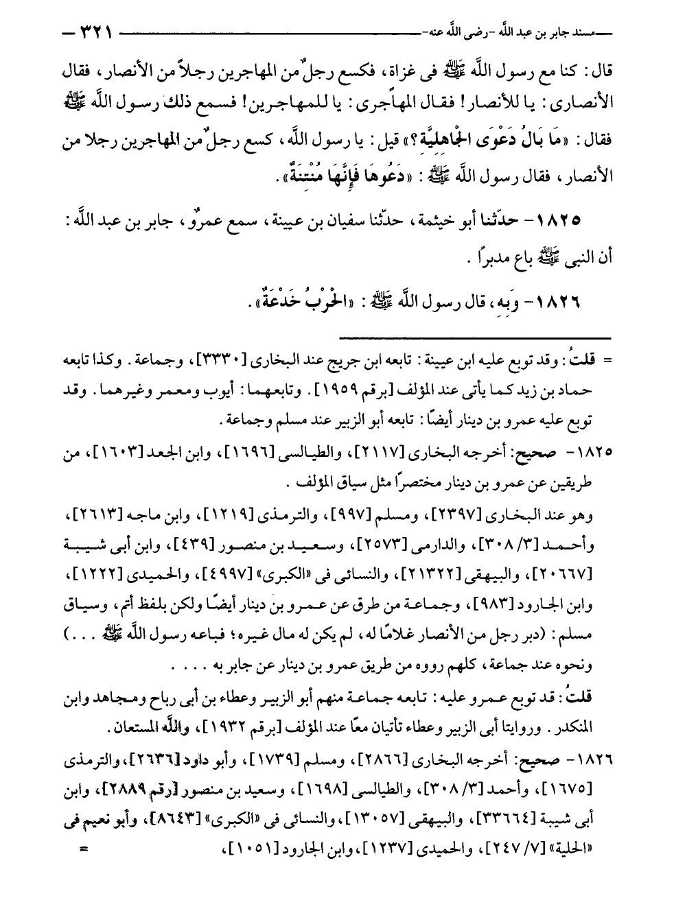 ١٨٢٦ - صحيح: أخرجه البخارى [٢٨٦٦]، ومسلم [١٧٣٩]، وأبو داود [٢٦٣٦]، والترمذى [١٦٧٥]، وأحمد [٣/ ٣٠٨]، والطيالسى [١٦٩٨]، وسعيد بن منصور [رقم ٢٨٨٩] وابن أبى شيبة [٣٣٦٦٤]، والبيهقى [١٣٠٥٧]، والنسائى في "الكبرى" [٨٦٤٣]، وأبو نعيم في "الحلية" [٧/ ٢٤٧]، والحميدى [١٢٣٧]، وابن الجارود [١٠٥١]،=