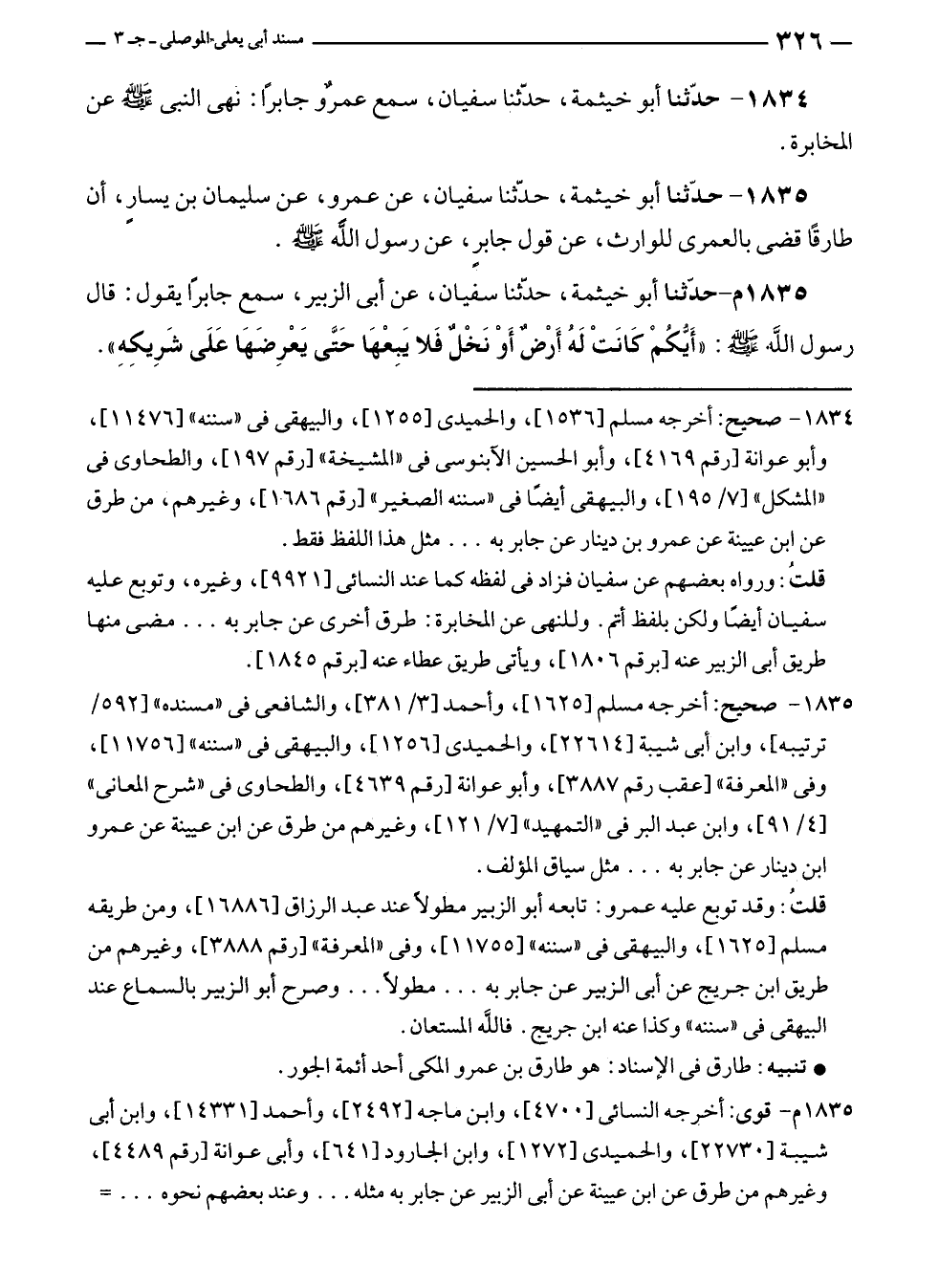 ١٨٣٥ م - حدّثنا أبو خيثمة، حدّثنا سفيان، عن أبى الزبير، سمع جابرًا يقول: قال رسول الله - صلى الله عليه وسلم -: "أَيُّكُمْ كانَتْ لَهُ أرْضٌ أَوْ نَخْلٌ فَلا يَبِعْهَا حَتَّى يَعْرِضَهَا عَلَى شَرِيكِهِ".