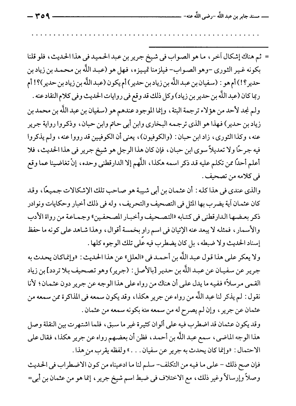 = ثم هناك إشكال آخر، ما هو الصواب في شيخ جرير بن عبد الحميد في هذا الحديث، فلو قلنا بكونه غير الثورى - وهو الصواب - فيلزمنا تمييزه، فهل هو (عبد الله بن محمد بن زياد بن حدير؟!) أم هو: (سفيان بن عبد الله بن زياد بن حدير) أم يكون (عبد الله بن زياد بن حدير)؟! أم ربما كان (عبد الله بن حدير بن زياد) وكل ذلك قد وقع في روايات الحديث وفى كلام النقاد عنه.