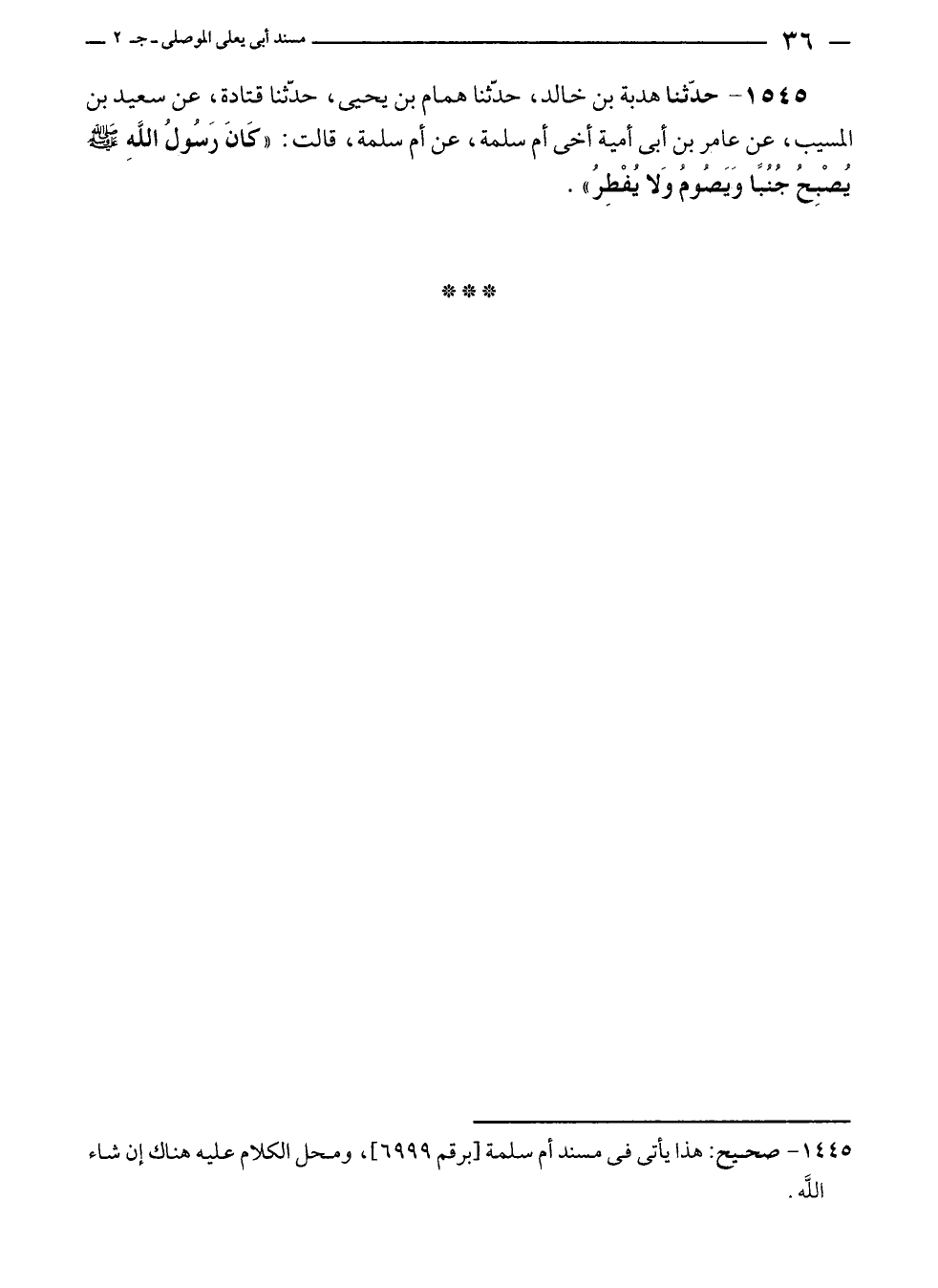 ١٥٤٥ - حدّثنا هدبة بن خالد، حدّثنا همام بن يحيى، حدّثنا قتادة، عن سعيد بن المسيب، عن عامر بن أبى أمية أخى أم سلمة، عن أم سلمة، قالت: "كَانَ رَسُولُ الله - صلى الله عليه وسلم - يُصْبِحُ جُنُبًا وَيَصُومُ وَلا يُفْطِرُ".
