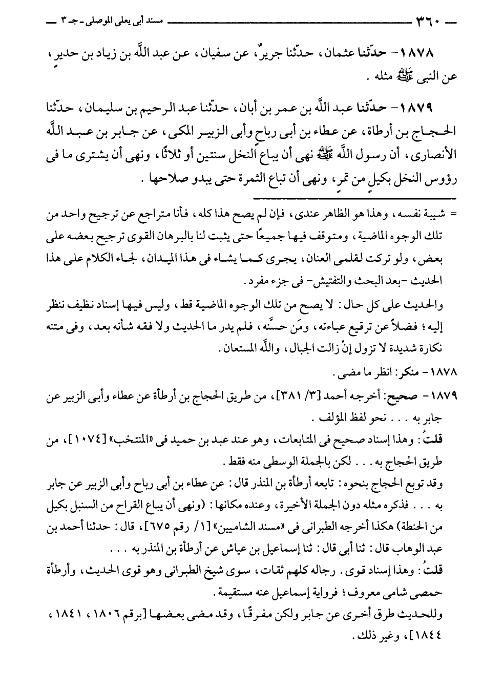 ١٨٧٩ - حدّثنا عبد الله بن عمر بن أبان، حدّثنا عبد الرحيم بن سليمان، حدّثنا الحجاج بن أرطأة، عن عطاء بن أبى رباحٍ وأبى الزبير المكى، عن جابر بن عبد الله الأنصارى، أن رسول الله - صلى الله عليه وسلم - نهى أن يباع النخل سنتين أو ثلاثًا، ونهى أن يشترى ما في رؤوس النخل بكيلٍ من تمرٍ، ونهى أن تباع الثمرة حتى يبدو صلاحها.