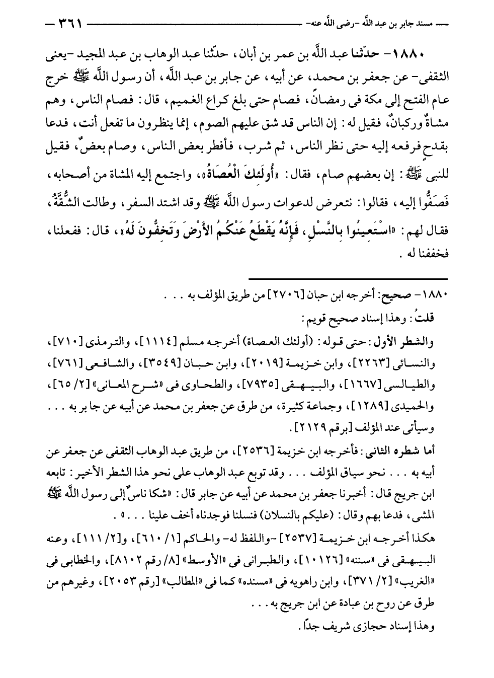 ١٨٨٠ - حدّثنا عبد الله بن عمر بن أبان، حدّثنا عبد الوهاب بن عبد المجيد - يعنى الثقفى - عن جعفر بن محمد، عن أبيه، عن جابر بن عبد الله، أن رسول الله - صلى الله عليه وسلم - خرج عام الفتح إلى مكة في رمضان، فصام حتى بلغ كراع الغميم، قال: فصام الناس، وهم مشاة وركبانُ فقيل له: إن الناس قد شق عليهم الصوم، إنما ينظرون ما تفعل أنت، فدعا بقدحٍ فرفعه إليه حتى نظر الناس، ثم شرب، فأفطر بعض الناس، وصام بعضٌ، فقيل للنبى - صلى الله عليه وسلم -: إن بعضهم صام، فقال: "أُولَئِكَ الْعُصَاةُ"، واجتمع إليه المشاة من أصحابه، فَصَفُّوا إليه، فقالوا: نتعرض لدعوات رسول الله - صلى الله عليه وسلم - وقد اشتد السفر، وطالت الشُّقَةُ، فقال لهم: "اسْتَعِينُوا بِالنَّسْلِ، فَإنَّهُ يَقْطَعُ عَنْكُمُ الأَرْضَ وَتَخِفُّونَ لَهُ"، قال: ففعلنا، فخففنا له.
