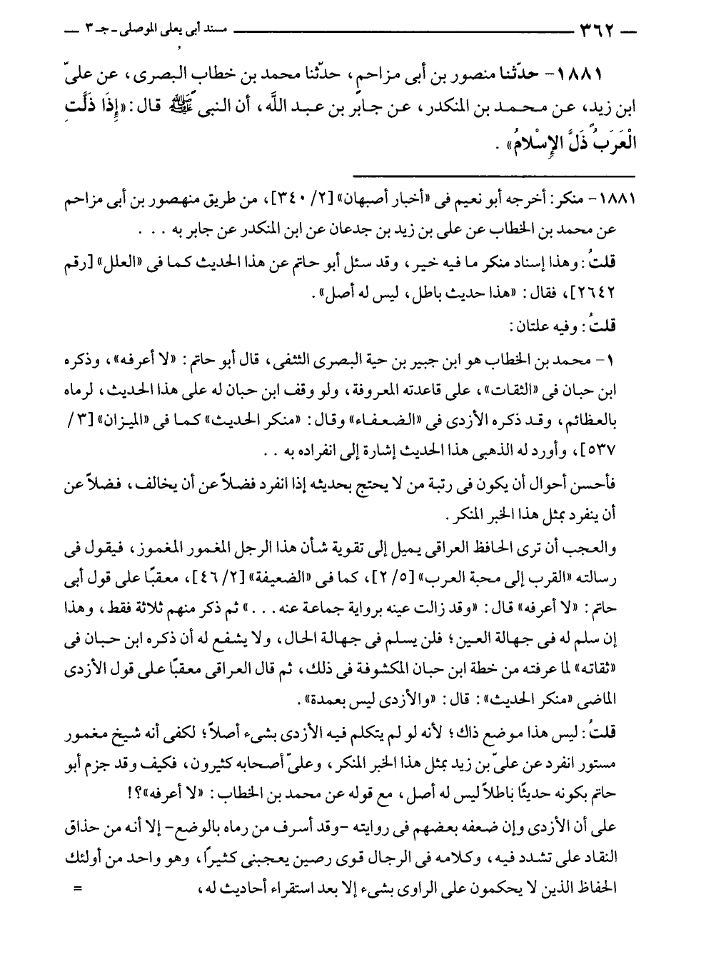 ١٨٨١ - حدّثنا منصور بن أبى مزاحمٍ، حدّثنا محمد بن خطاب البصرى، عن عليّ بن زيدٍ، عن محمد بن المنكدر، عن جابر بن عبد الله، أن النبي - صلى الله عليه وسلم - قال: "إذَا ذَلَّتِ الْعَرَبُ ذَلَّ الإسلامُ".