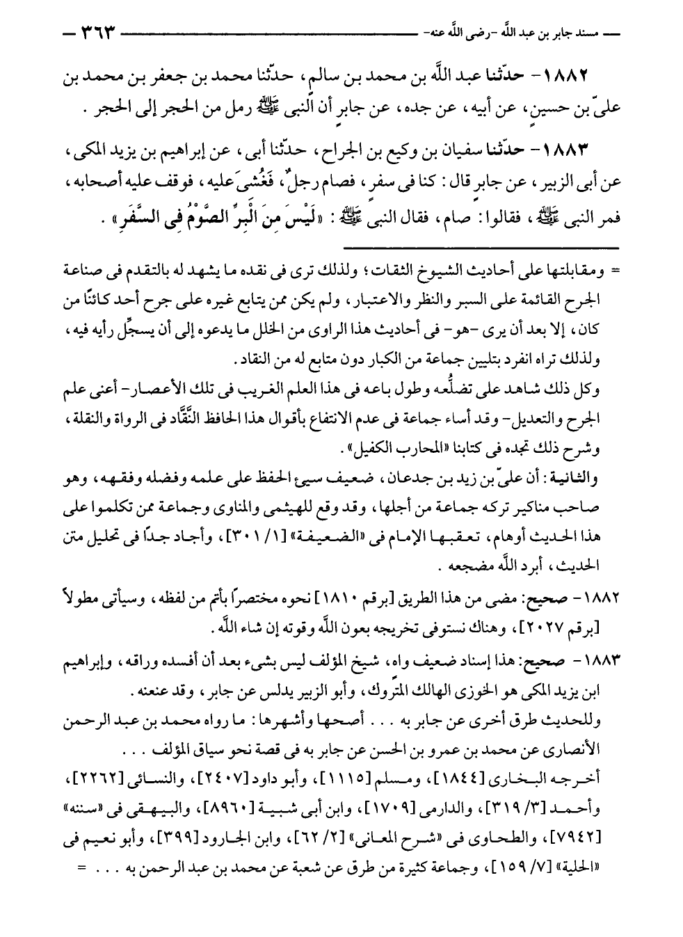 ١٨٨٣ - حدّثنا سفيان بن وكيع بن الجراح، حدّثنا أبى، عن إبراهيم بن يزيد المكى، عن أبى الزبير، عن جابر قال: كنا في سفرٍ، فصام رجلٌ، فَغُشِىَ عليه، فوقف عليه أصحابه، فمر النبي - صلى الله عليه وسلم -، فقالوا: صام، فقال النبي - صلى الله عليه وسلم -: "لَيْسَ مِنَ الْبِرِّ الصَّوْمُ فِي السَّفَرِ".