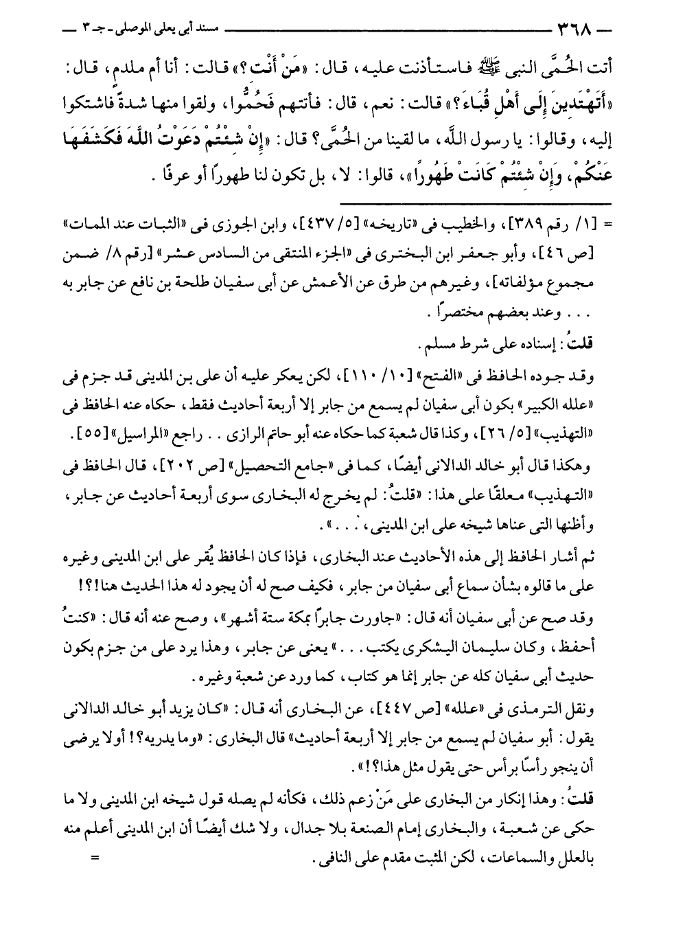 ثم أشار الحافظ إلى هذه الأحاديث عند البخارى، فإذا كان الحافظ يُقر على ابن المدينى وغيره على ما قالوه بشأن سماع أبى سفيان من جابر، فكيف صح له أن يجود له هذا الحديث هنا!؟!