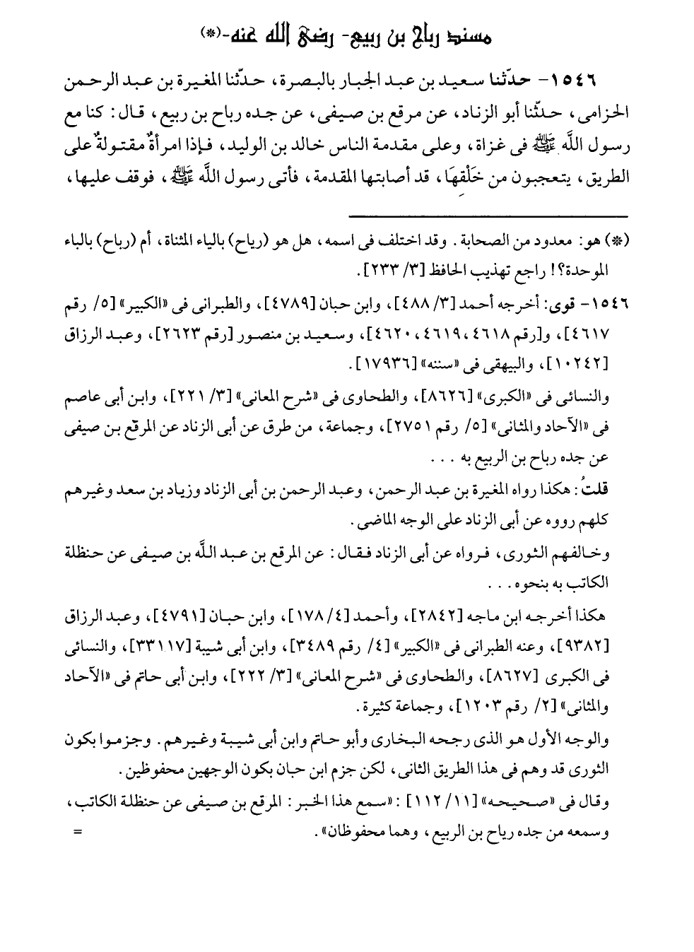 ١٥٤٦ - حدّثنا سعيد بن عبد الجبار بالبصرة، حدّثنا المغيرة بن عبد الرحمن الحزامى، حدثّنا أبو الزناد، عن مرقع بن صيفى، عن جده رباح بن ربيع، قال: كنا مع رسول الله - صلى الله عليه وسلم - في غزاة، وعلى مقدمة الناس خالد بن الوليد، فإذا امرأةٌ مقتولةٌ على الطريق، يتعجبون من خَلْقِهَا، قد أصابتها المقدمة، فأتى رسول الله - صلى الله عليه وسلم -، فوقف عليها،