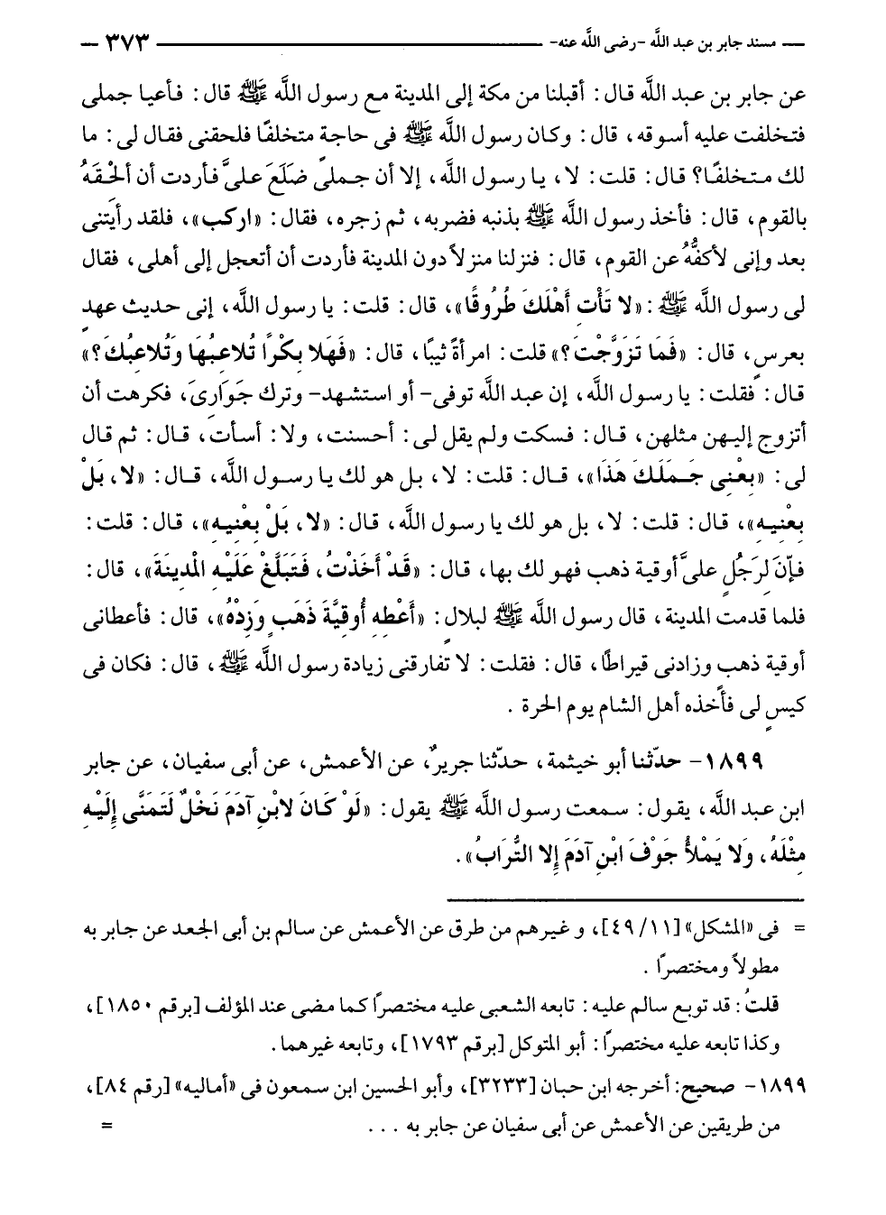 عن جابر بن عبد الله قال: أقبلنا من مكة إلى المدينة مع رسول الله - صلى الله عليه وسلم - قال: فأعيا جملى فتخلفت عليه أسوقه، قال: وكان رسول الله - صلى الله عليه وسلم - في حاجةٍ متخلفًا فلحقنى فقال لى: ما لك متخلفًا؟ قال: قلت: لا، يا رسول الله - صلى الله عليه وسلم -، إلا أن جملى ضَلَعَ عليَّ فأردت أن ألحْقَهُ بالقوم، قال: فأخذ رسول الله - صلى الله عليه وسلم - بذنبه فضربه، ثم زجره، فقال: "اركب"، فلقد رأيَتنى بعد وإنى لأكفُّهُ عن القوم، قال: فنزلنا منزلًا دون المدينة فأردت أن أتعجل إلى أهلى، فقال لى رسول الله - صلى الله عليه وسلم -: "لا تَأْتِ أَهْلَكَ طُرُوقًا"، قال: قلت: يا رسول الله - صلى الله عليه وسلم -، إنى حديث عهدٍ بعرس، قال: "فَمَا تَزَوَّجْتَ؟ " قلت: امرأةً ثيبًا، قال: "فَهَلا بِكْرًا تُلاعِبُهَا وَتُلاعِبُكَ؟ " قال: فقلت: يا رسول الله - صلى الله عليه وسلم -، إن عبد الله توفى - أو استشهد - وترك جَوَارِىَ، فكرهت أن أتزوج إليهن مثلهن، قال: فسكت ولم يقل لى: أحسنت، ولا: أسأت، قال: ثم قال لى: "بِعْنِى جَمَلَكَ هَذَا"، قال: قلت: لا، بل هو لك يا رسول الله - صلى الله عليه وسلم -، قال: "لا، بَلْ بِعْنِيهِ"، قال: قلت: لا، بل هو لك يا رسول الله - صلى الله عليه وسلم -، قال: "لا، بَلْ بِعْنِيهِ"، قال: قلت: فإّنَ لِرَجُلٍ عليَّ أوقية ذهب فهو لك بها، قال: "قَدْ أَخَذْتُ، فَتَبَلَّغْ عَلَيْهِ المدِينَةَ"، قال: فلما قدمت المدينة، قال رسول الله - صلى الله عليه وسلم -؛ لبلالٍ: "أَعْطِهِ أُوقِيَّةَ ذَهَبِ وَزِدْهُ"، قال: فأعطانى أوقية ذهبٍ وزادنى قيراطًا، قال: فقلت: لا تفارقنى زيادة رسول اللَّه - صلى الله عليه وسلم -، قال: فكان في كيسٍ لى فأخذه أهل الشام يوم الحرة.