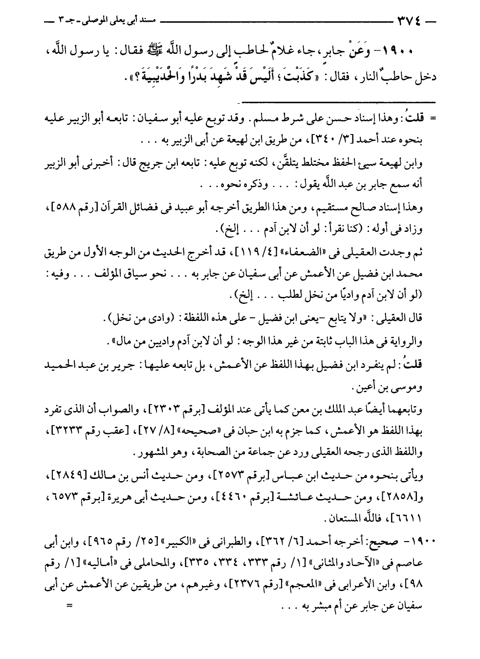 ١٩٠٠ - وَعَنْ جابر، جاء غلام لحاطب إلى رسول الله - صلى الله عليه وسلم - فقال: يا رسول الله - صلى الله عليه وسلم -، دخل حاطبٌ النار، فقال: "كَذَبْتَ؛ أَلَيْسَ قَدْ شَهِدَ بَدْرًا وَالحُدَيْبِيَةَ؟ ".
