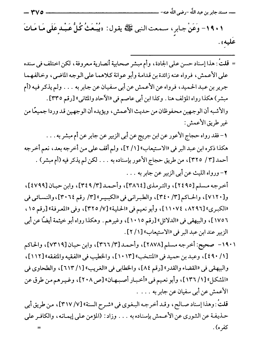 ١٩٠١ - صحيح: أخرجه مسلم [٢٨٧٨]، وأحمد [٣/ ٣٦٦]، وابن حبان [٧٣١٩]، والحاكم [١/ ٤٩٠]، وعبد بن حميد في "المنتخب" [١٠١٣]، والخطيب في "الفقيه والمتفقه" [١١٢]، والبيهقى في "القضاء والقدر" [رقم ٨٤]، والخطابى في "الغريب" [١/ ٦١٣]، والطحاوى في "المشكل" [١/ ١٣٦]، وأبو نعيم في "أخبار أصبهان" [ص ٢٠٨]، وغيرهم من طرق عن الأعمش عن أبى سفيان عن جابر به ....